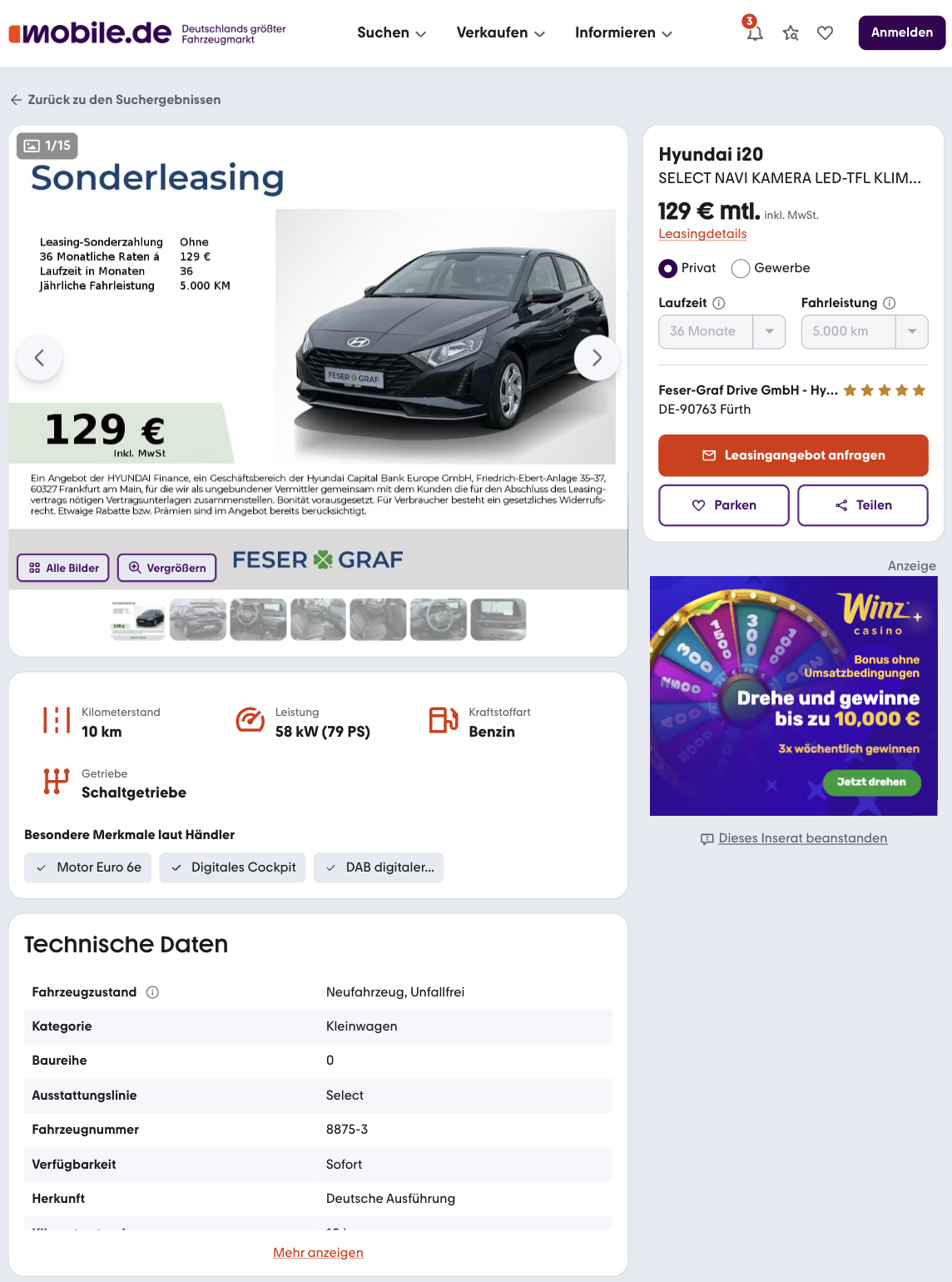Der Hyundai i20 1.2 Select ist eine einfache und praktische Lösung für den Alltag. Hyundai i20 1.2 Select bei mobile.de für 129 Euro im Monat brutto, als sofort verfügbarer Lagerwagen in Aurora Grey Metallic. Kalkuliert ist das Angebot mit 36 Monaten Laufzeit und 5.000 Kilometern pro Jahr, damit bleibt die Rate niedrig und die Kosten gut planbar.