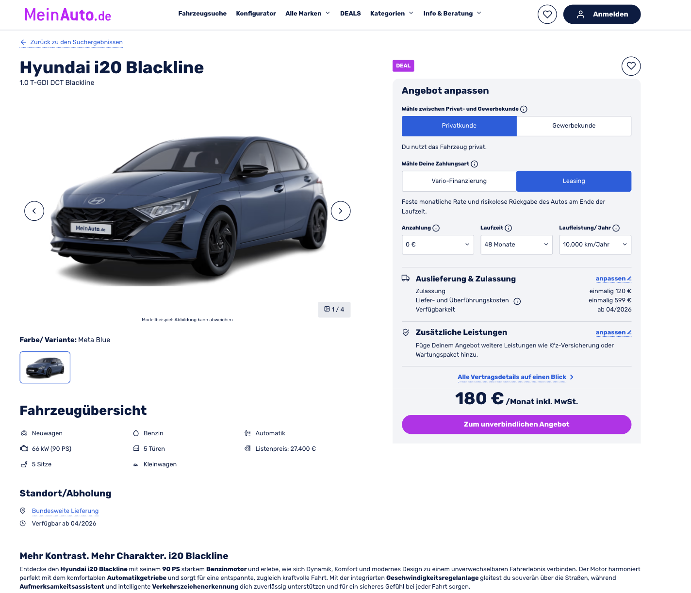 Der Hyundai i20 trifft genau den Nerv, wenn ein kompakter Allrounder gesucht wird, der modern ausgestattet ist und im Alltag unkompliziert bleibt. Jetzt könnt ihr den Hyundai i20 1.0 T-GDI DCT Blackline bei MeinAuto für 180 Euro brutto im Monat leasen, sowohl für Privat- und Geschäftskunden. Wichtig dabei, es geht nicht um eine vage Bestellung, sondern um ein bereits bestelltes Vorlauffahrzeug mit umfangreicher Ausstattung. Die Farbe lautet Meta Blue, die Auslieferung ist für April 2026 vorgesehen, also klar planbar.