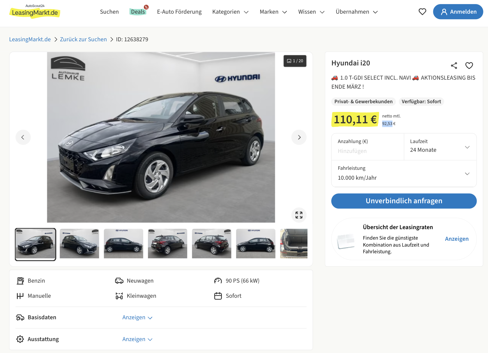 Hyundai i20 im Leasing als Lagerwagen für 110 Euro im Monat brutto