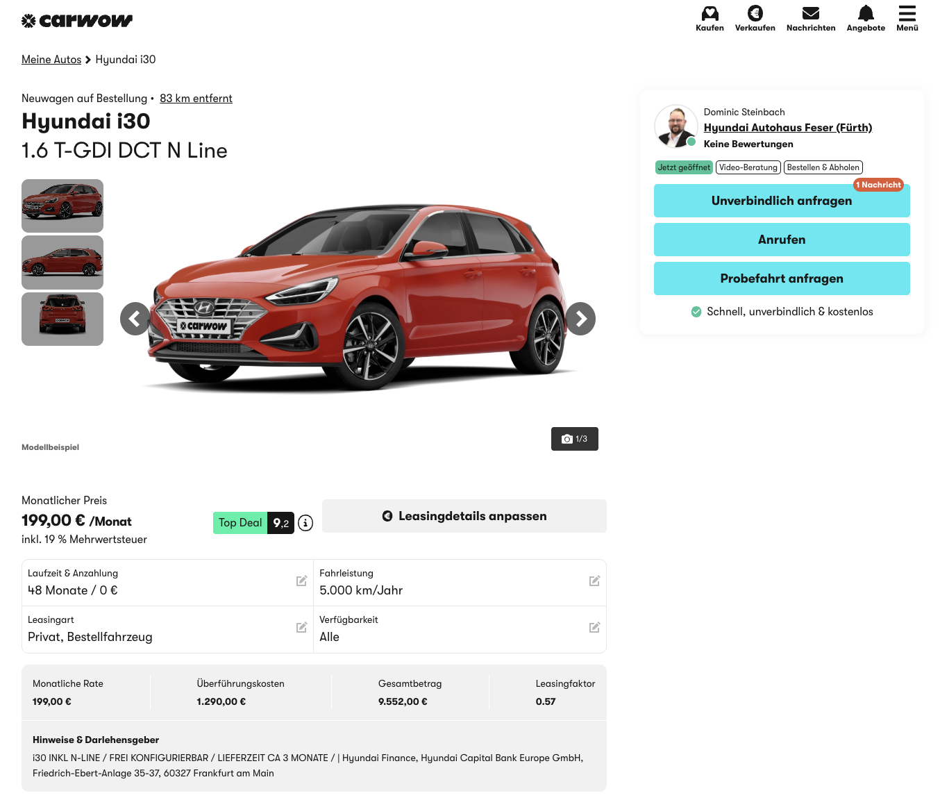 Hyundai i30 im Leasing als Bestellfahrzeug für 199 Euro im Monat brutto