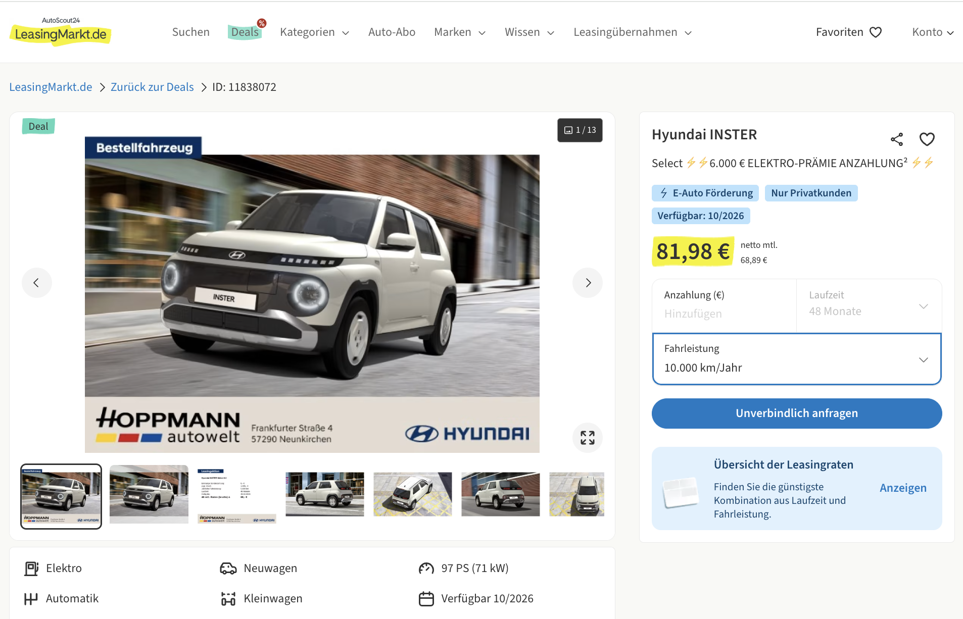 Hyundai Inster im Leasing als Bestellfahrzeug für 82 [249] Euro brutto pro Monat