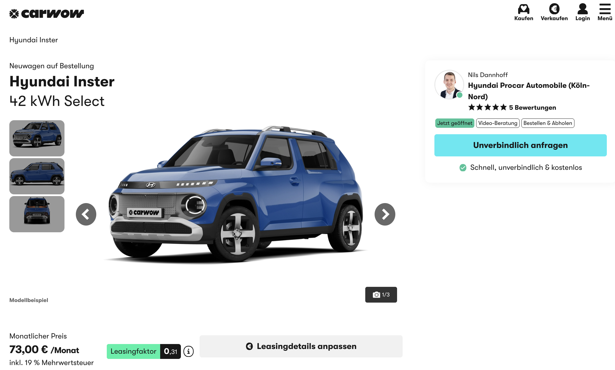 Hyundai liefert den Volks-Wagen, auf den wir so lange warten! Der Hyundai Inster 42 kWh Select zeigt, wie der erschwingliche Umstieg auf Elektromobilität gelingt. Carwow hat den cleveren City-Stromer für nur 73 Euro brutto im Monat im Angebot. Das Fahrzeug ist frei konfigurierbare, bei voller Erstattung der E-Auto-Prämie profitiert ihr von einem Leasingfaktor von 0,31!