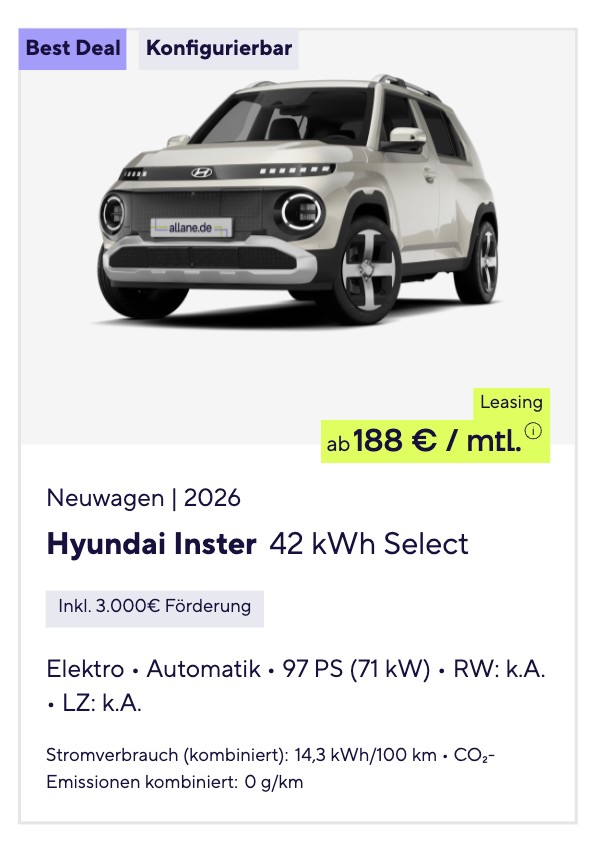 Der Hyundai Inster 42 kWh Select bei Allane für 188 Euro brutto im Monat ist ein Angebot für alle, die ein kompaktes Elektroauto suchen, beim Vertragsende aber bewusst nicht schon heute alles festzurren möchten. Genau das macht diesen Deal interessant. Statt klassischem Leasing mit festem Schlussstrich setzt Allane hier auf Vario-Leasing, also auf ein Modell, das mehr Entscheidungsspielraum lässt. Kalkuliert wurde das Angebot mit 3.000 Euro Anzahlung, 48 Monaten Laufzeit und 10.000 Kilometern pro Jahr. Gleichzeitig wird der Inster als frei konfigurierbares Bestellfahrzeug angeboten, was zusätzliche Freiheit bei Farbe und Ausstattungsdetails schafft.