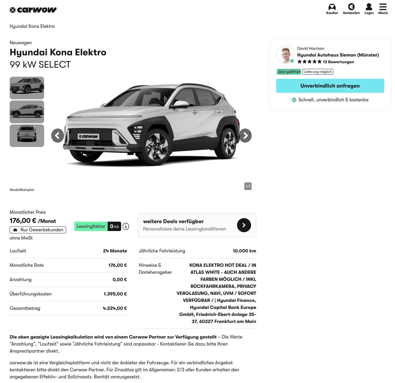 Kalkuliert ist das carwow Angebot auf 24 Monate und 10.000 Kilometer pro Jahr, die Laufleistung lässt sich an das tatsächliche Profil anpassen.