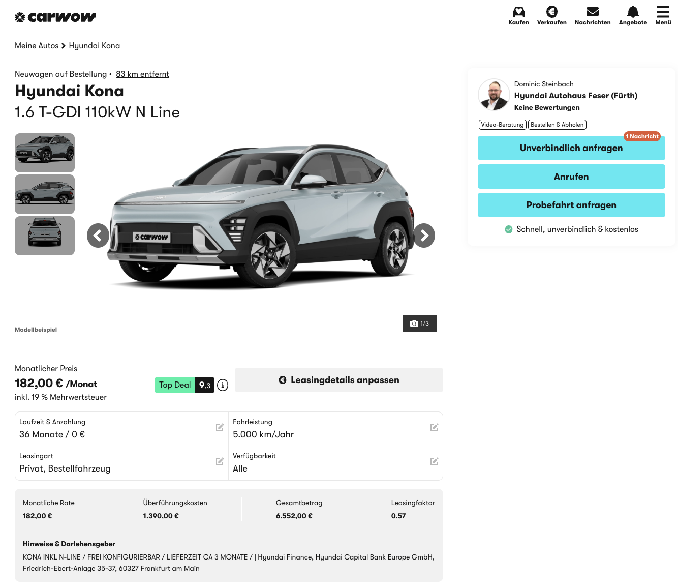 Ein kompaktes SUV mit sportlicher Ausrichtung muss nicht automatisch in Regionen rutschen, in denen die Leasingrate den guten Eindruck direkt wieder relativiert. Genau an diesem Punkt wird der Hyundai Kona 1.6 T-GDI 110 kW N Line bei carwow für 182 Euro brutto im Monat interessant. Das Angebot richtet sich an Privatkunden und verbindet einen modernen Auftritt mit einer Monatsrate, die für ein aktuelles, gut ausgestattetes Kompakt-SUV absolut konkurrenzfähig wirkt. Dazu kommt ein Vorteil, der bei Neuwagen besonders wichtig ist, der Kona wird als frei konfigurierbares Bestellfahrzeug angeboten. Farbe, Ausstattungsdetails und individuelle Wünsche lassen sich also passend zum eigenen Geschmack festlegen. Mit einer Lieferzeit von rund drei Monaten bleibt auch der Zeitraum bis zur Übergabe angenehm überschaubar.