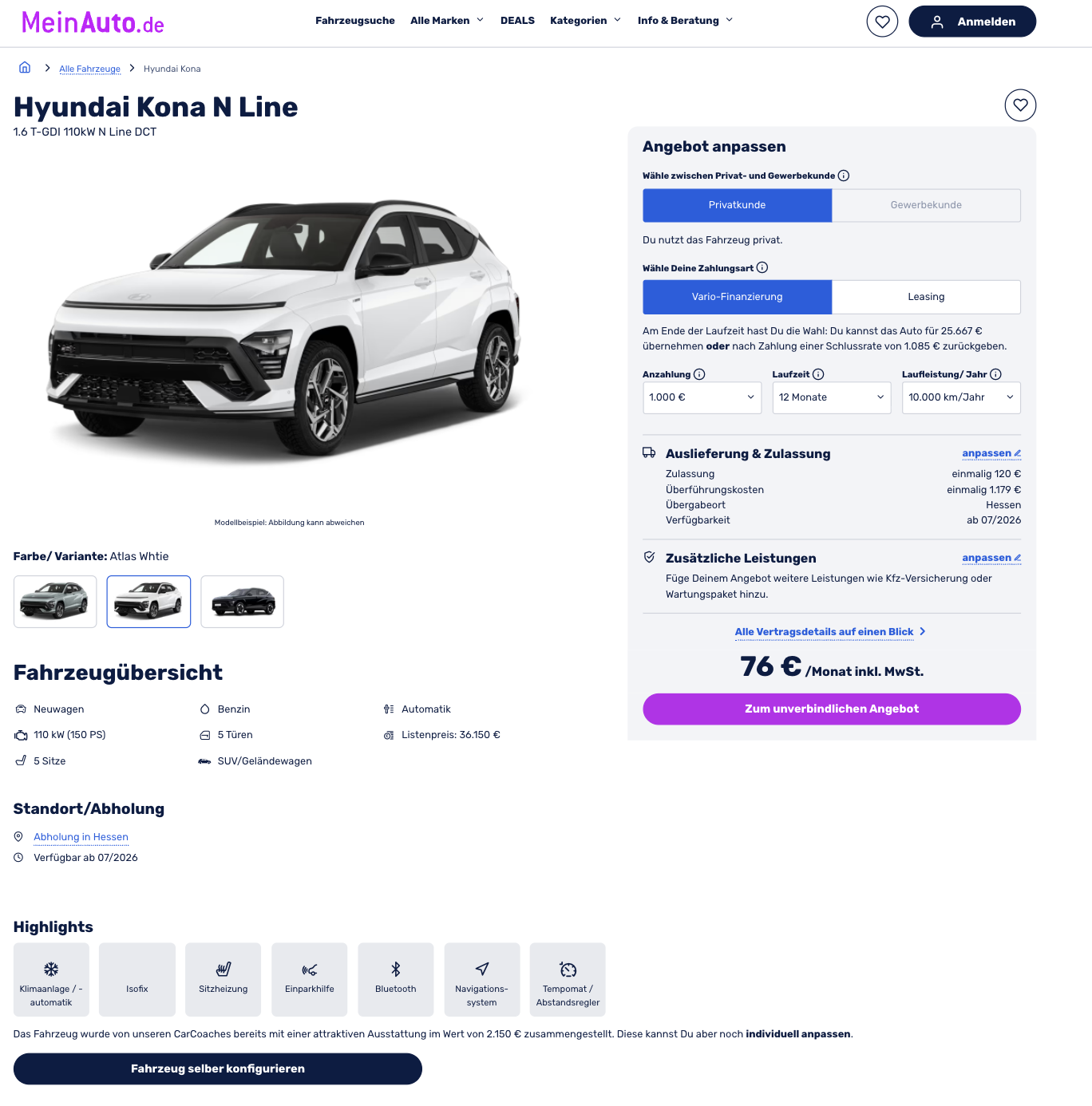 Hyundai Kona 1.6 T GDI 110 kW DCT N Line bei MeinAuto für 76 Euro brutto im Monat im Vario Leasing, mit 1.000 Euro Anzahlung. Angebot wurde mit einer Laufzeit von 12 Monate kalkuliert und, danach steht die Wahl, Übernahme für 25.667 Euro oder Rückgabe gegen 1.085 Euro Schlussrate. Wer ohne Sonderzahlung kalkuliert, landet bei 159,33 Euro brutto pro Monat. Vorkonfiguriert ist das Fahrzeug ebenfalls, erhältlich in Mirage Green, Atlas White oder Abyss Black Mineraleffekt, verfügbar ab Juli 2026.