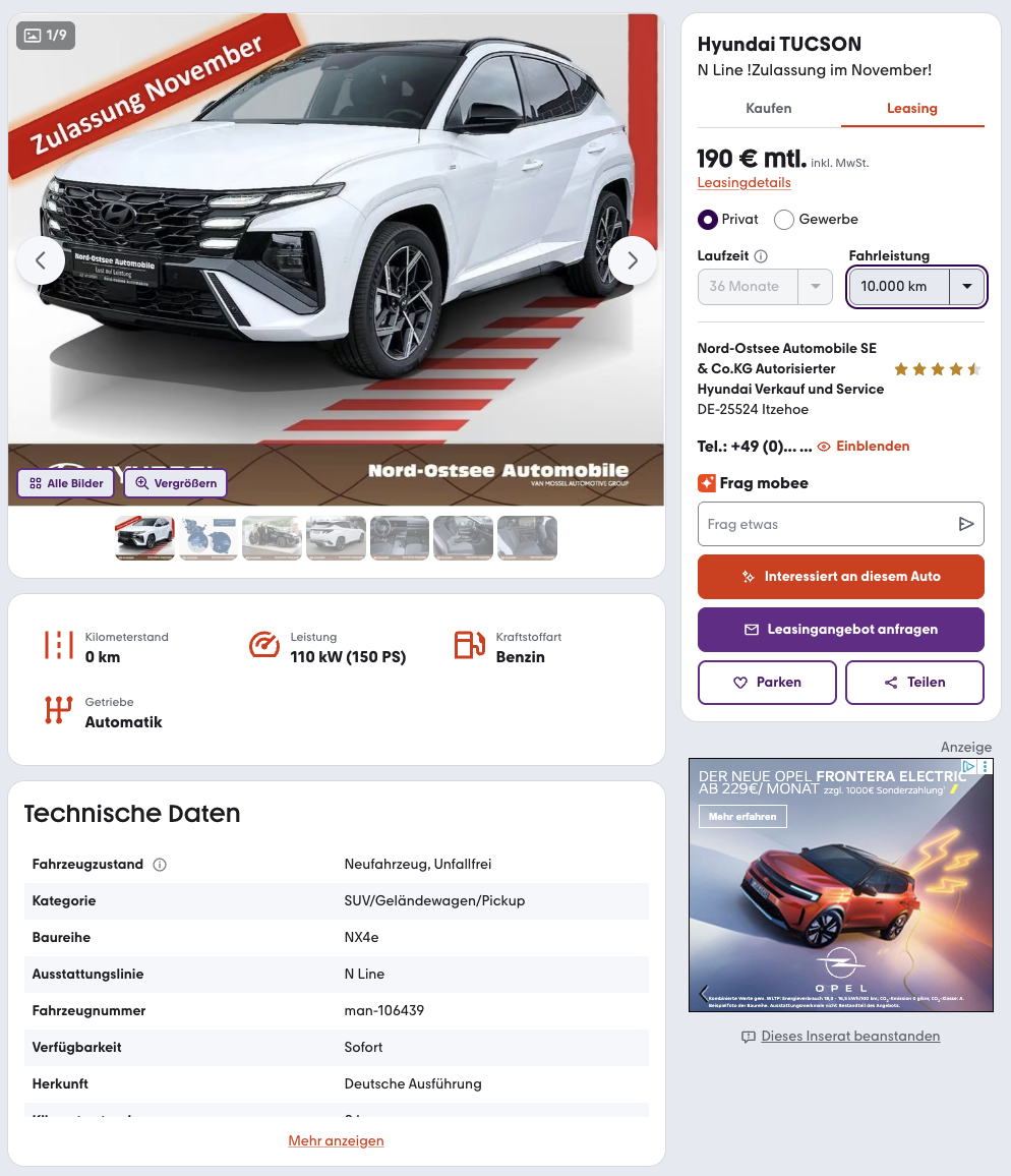 Sportlicher Auftritt, klare Kante, überraschend viel Alltagstalent. Der Hyundai Tucson 1.6 T-GDI DCT N Line ist bei mobile.de für 190 € brutto pro Monat als sofort verfügbarer Lagerwagen erhältlich. Die Zulassung im November 2025 ist verpflichtend. In Atlas White mit schwarzem Interieur steht ein Paket bereit, das optisch zupackt und in der Budgetzeile angenehm schlank bleibt.