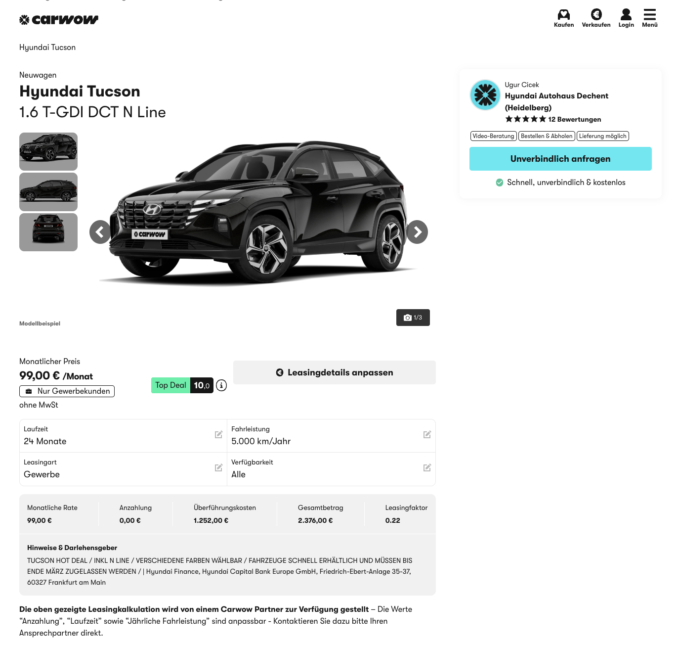 Der Hyundai Tucson ist ein kompaktes SUV mit sportlicher Ausprägung und moderner Ausstattung. Geschäftskunden können den Hyundai Tucson 1.6 T-GDI DCT N Line bei carwow für 99 Euro netto pro Monat leasen. Das Fahrzeug ist kurzfristig in verschiedenen Farben verfügbar, die Zulassung muss bis Ende März erfolgen.