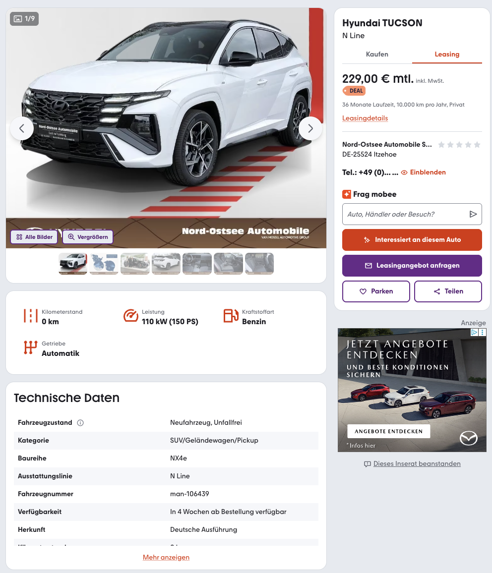 Kompakt SUV mit sportlichem Look und schneller Verfügbarkeit! Der Hyundai Tucson ist im deutschen SUV Alltag längst angekommen, weil er Design, Platz und moderne Technik in eine Form bringt, die nicht beliebig wirkt. Bei mobile.de gibt es den Hyundai Tucson 1.6 T-GDI DCT N Line für 229 Euro brutto pro Monat, geeignet für Privatkunden und Geschäftskunden. Besonders attraktiv ist hier die Ausgangslage, es handelt sich um ein bereits bestelltes Vorlauffahrzeug mit rund vier Wochen Lieferzeit, also keine klassische Bestellnummer mit monatelanger Warteschleife, sondern ein Deal, der zeitlich realistisch bleibt.