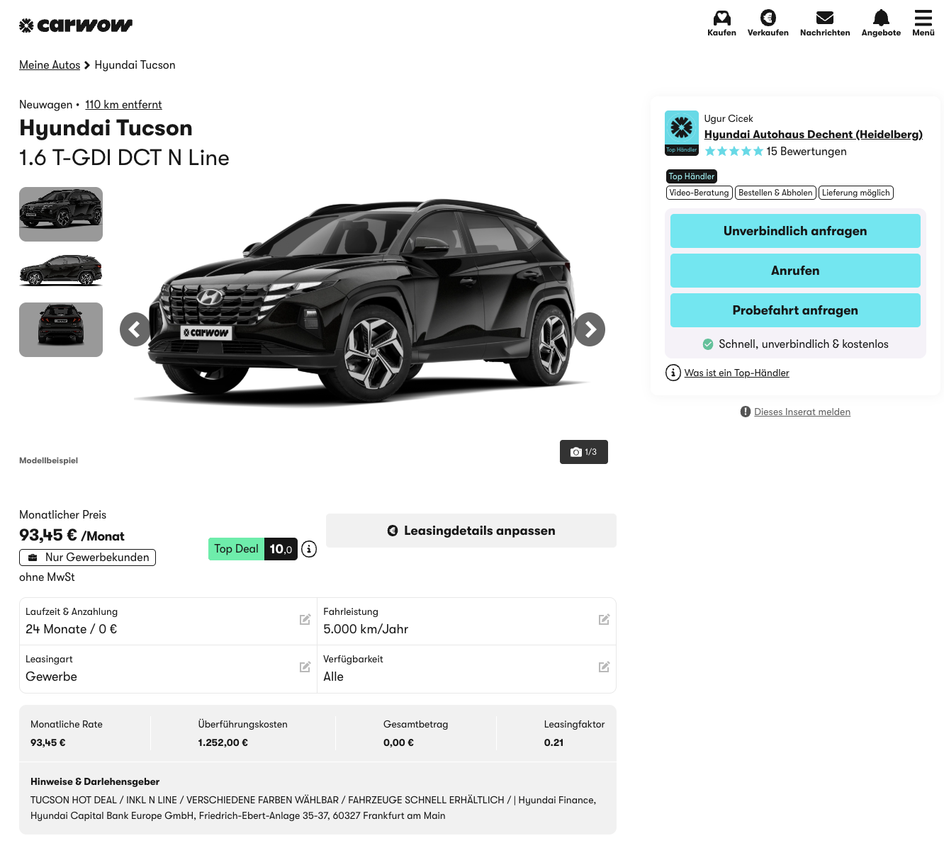Wer ein gut ausgestattetes SUV sucht und dabei auf die Kosten achtet, findet hier ein interessantes Angebot. Hyundai Tucson 1.6 T-GDI DCT N Line bei carwow für 93,45 Euro netto im Monat richtet sich gezielt an Geschäftskunden. Die Berechnung erfolgt über 24 Monate Laufzeit und 5.000 Kilometer jährlich, wodurch sich eine klare und überschaubare Kalkulation ergibt. Der Leasingfaktor von 0,25 zeigt bereits, wohin die Reise geht, preislich gehört dieses Angebot aktuell zu den auffälligeren im Markt. Vorteilhaft ist zudem, dass der Tucson kurzfristig verfügbar ist und in mehreren Farben bereitsteht.