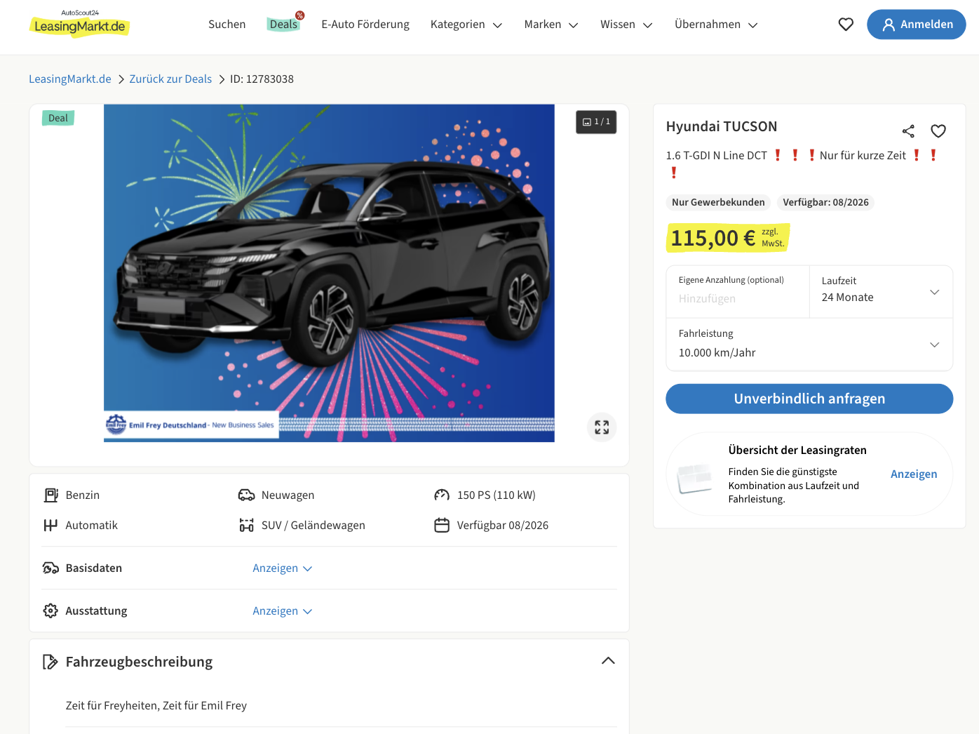 Ein Mittelklasse-SUV mit moderner Ausstattung und gleichzeitig überschaubarer Rate ist aktuell keine Selbstverständlichkeit. Hyundai Tucson 1.6 T-GDI DCT N Line bei LeasingMarkt für 115 Euro netto im Monat setzt genau hier an und bietet ein Angebot, das vor allem durch seine klare Preisstruktur auffällt. Das Fahrzeug kann in Sachen Ausstattung und Lackierung angepasst werden und ist ab August 2026 verfügbar.