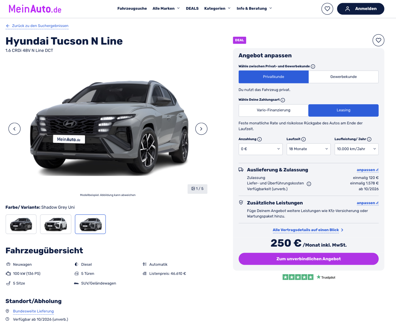 Kurze Laufzeit, kräftiger Diesel, sportlicher Look. Den Hyundai Tucson 1.6 CRDi 48V DCT N Line gibt es aktuell bei MeinAuto für 250 Euro brutto im Monat und setzt genau dort an und kombiniert einen sparsamen Diesel-Mildhybrid mit einer kurzen Leasinglaufzeit von 18 Monaten. Jährlich sind 10.000 Kilometer enthalten, Anpassungen sind möglich. Der vorkonfigurierte Tucson ist in Shadow Grey, Serenity White und Abyss Black erhältlich, verfügbar ab Oktober 2026. Die Überführungskosten liegen bei 1.698 Euro inklusive Zulassung und Haustürlieferung.