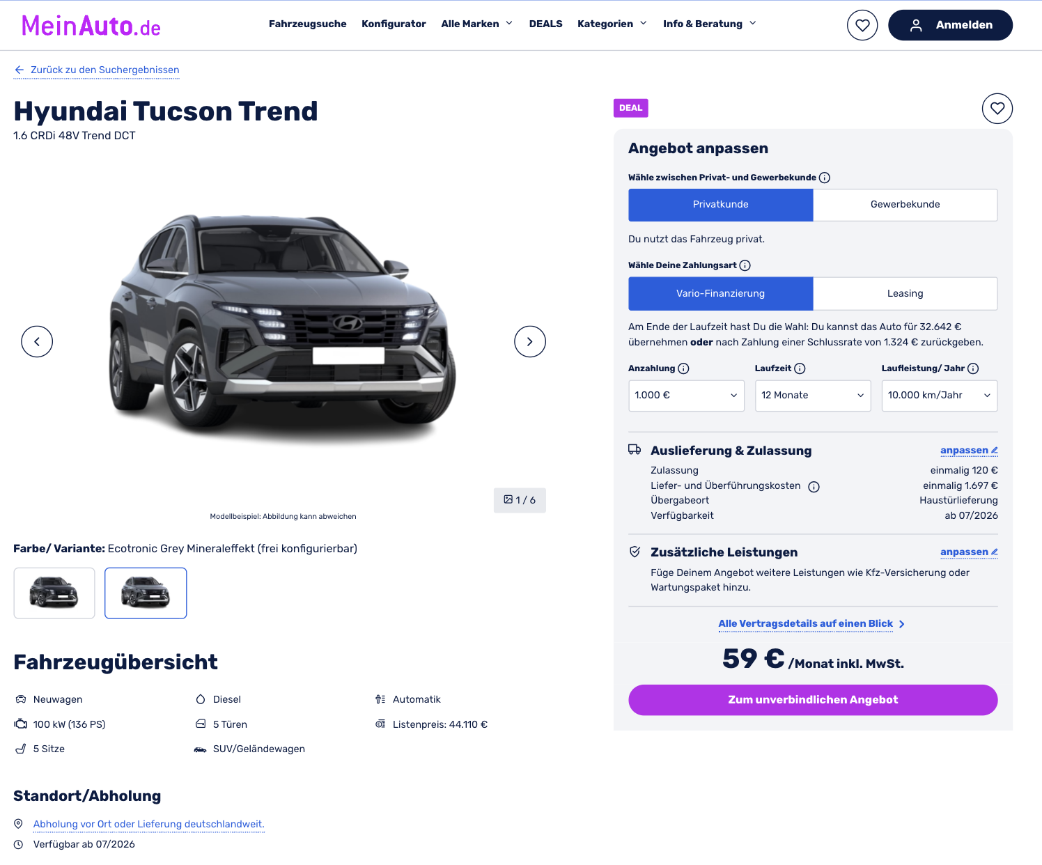 Wer lieber klassisch leasen möchte, bekommt den Tucson alternativ für 164 Euro brutto pro Monat, ebenfalls mit 1.000 Euro Anzahlung. In beiden Fällen handelt es sich um ein frei konfigurierbares Bestellfahrzeug, die Auslieferung ist für Juli 2026 geplant.