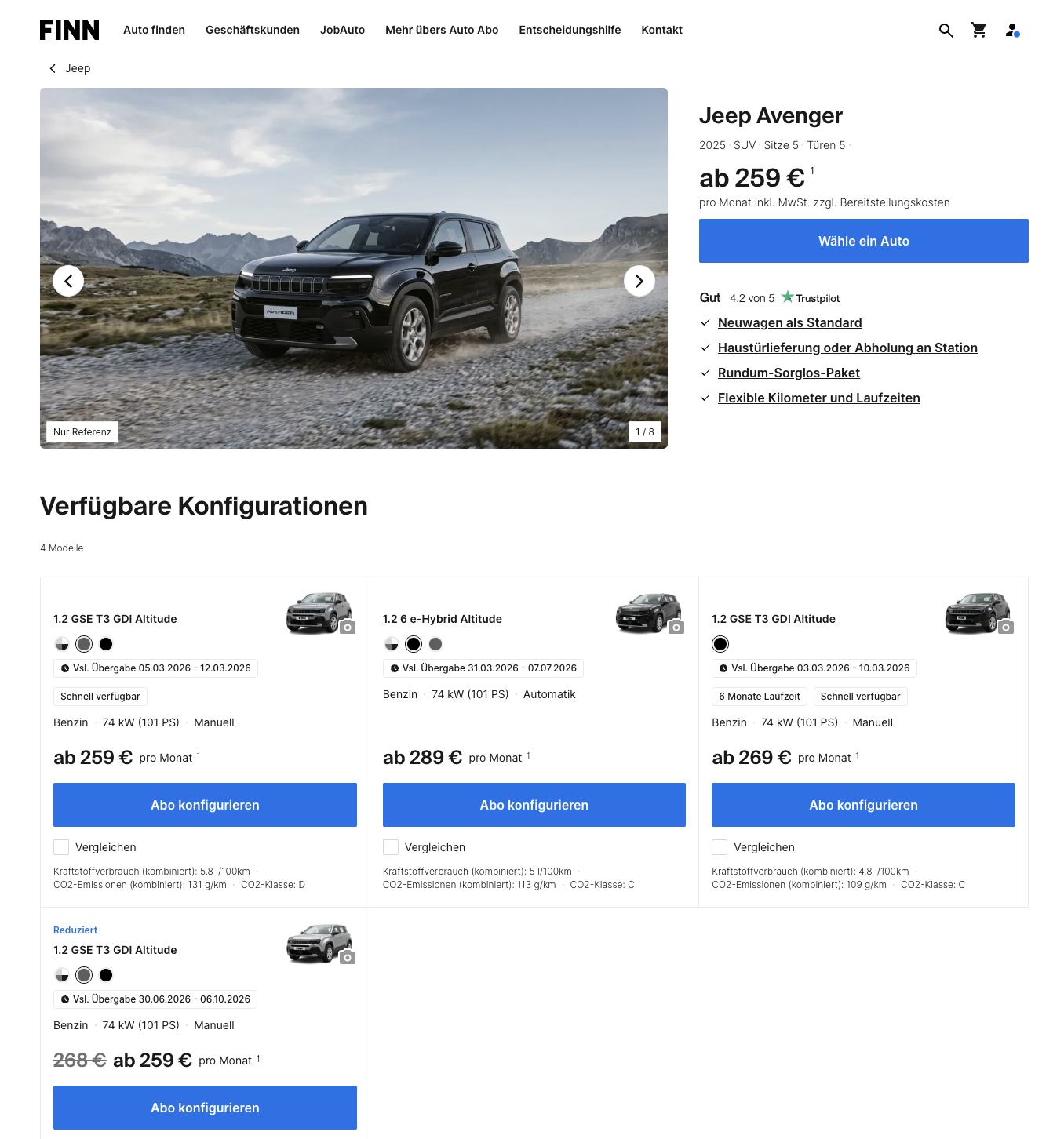 Jeep Avenger im Auto-Abo, kompakter SUV mit Fixkosten-Logik! Bei FINN gibt es den Jeep Avenger 1.2 GSE T3 GDI im All-inclusive Auto-Abo für 259 Euro brutto pro Monat verfügbar und richtet sich an alle, die ein SUV nutzen möchten, ohne sich langfristig festzulegen. Das Fahrzeug steht in Storm Grey Uni bereit und ist vom 05.03.2026 bis 12.03.2026 verfügbar, dadurch lässt sich der Einstieg kurzfristig planen.