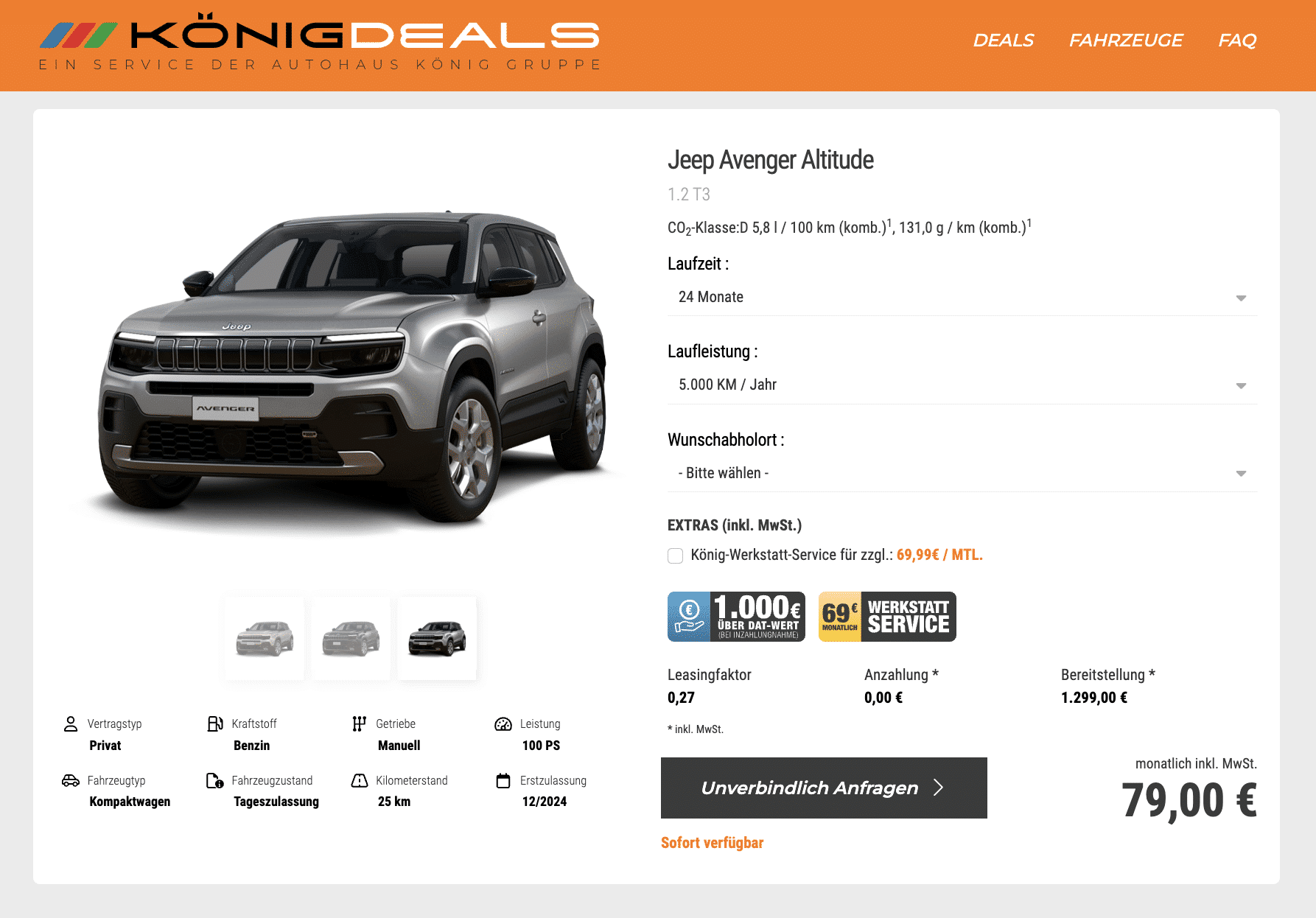 Ihr wollt ein frisches SUV mit moderner Ausstattung, ohne lange Wartezeit und ohne große Rate? Dann ist dieser Jeep Avenger als Tageszulassung genau der richtige Deal. Bei KÖNIGDEALS startet das Leasing ab 79 € brutto/Monat (bei 5.000 km/Jahr); wer 10.000 km/Jahr bevorzugt, landet bei nur 101 € brutto/Monat. Das Fahrzeug wurde im Dezember 2024 zugelassen, hat lediglich ca. 25 km auf dem Tacho und steht damit faktisch neuwertig bereit.