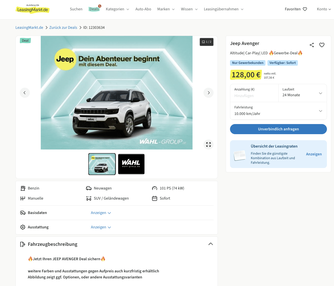 Bei LeasingMarkt steht der Jeep Avenger 1.2 GSE T3 GDI Altitude als sofort verfügbarer Lagerwagen in Snow White für 107,56 Euro netto pro Monat bereit, kalkuliert mit 24 Monaten Laufzeit und 10.000 Kilometern pro Jahr. Genau dieses Fahrzeug könnt ihr ohne Wartezeit übernehmen, weitere Farben und Ausstattungen sind kurzfristig gegen Aufpreis zu haben, ihr bleibt also flexibel, ohne den Preisvorteil zu verlieren. Unterm Strich bekommt ihr Jeep-Charakter zum City-Tarif, sauber kalkuliert und schnell startklar.
