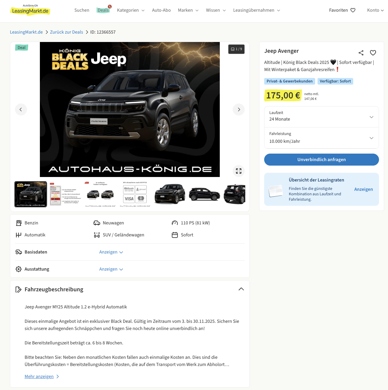 Bei LeasingMarkt wartet der Jeep Avenger 1.2 e-Hybrid Automatik Altitude für monatlich 175 Euro brutto auf euch, buchbar für Privat- und Geschäftskunden. Es handelt sich um Lagerwagen in Volcano Black, Granite Grey und Stone Grey, die Bereitstellung liegt bei etwa sechs bis acht Wochen, damit ihr nicht lange auf euren City-Abenteurer warten müsst. Preis, Verfügbarkeit und Ausstattung spielen hier angenehm zusammen, sodass ihr ohne großes Tamtam einsteigen könnt.