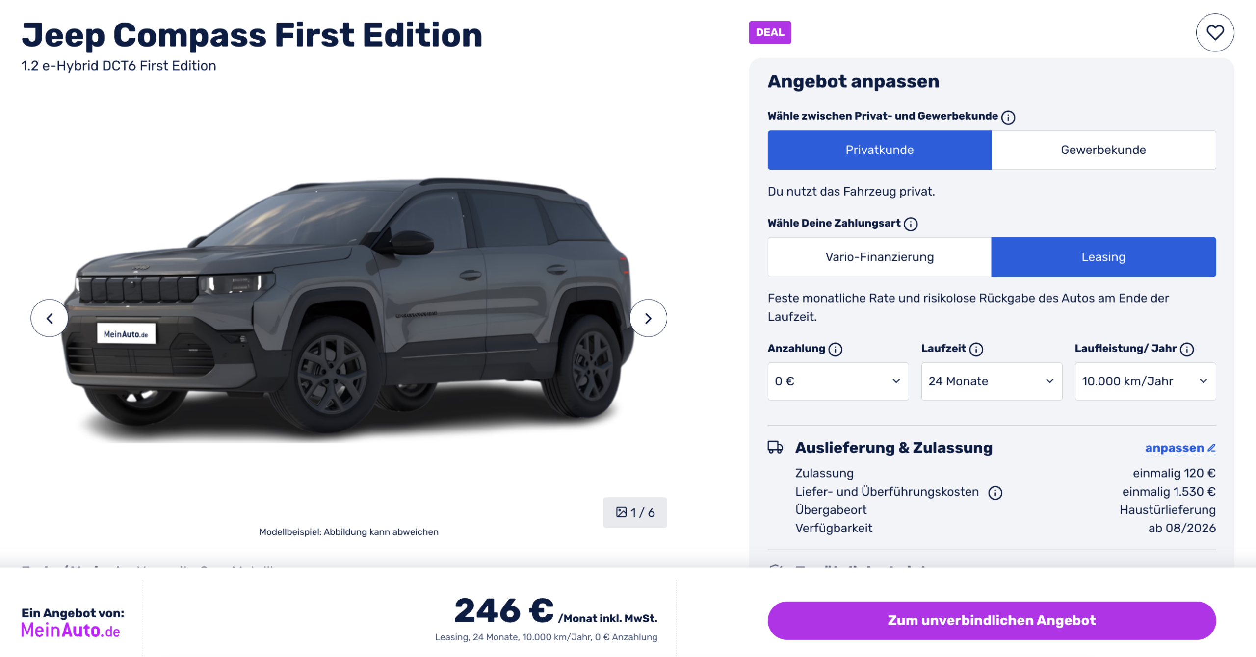 Der Jeep Compass verbindet markantes SUV-Design mit moderner Hybridtechnik und digitalem Innenraum. Sichert euch den Jeep Compass 1.2 e-Hybrid First Edition bei MeinAuto.de für 246 Euro brutto im Monat. Das Angebot richtet sich an Privat- sowie Geschäftkunden und basiert auf einer Lieferung ab August 2026. Gerade die Kombination aus klassischer Jeep-DNA, moderner Technik und elektrifizierter Effizienz macht dieses Modell besonders spannend im Segment der kompakten SUVs.