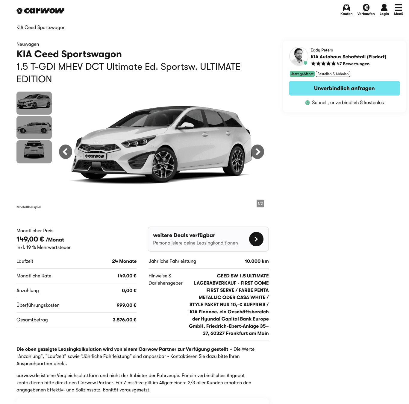 Die 149 Euro brutto sind klar kalkuliert, 24 Monate und 10.000 Kilometer pro Jahr bilden eine solide Basis, Anpassungen sind möglich. Während der Platzhirsch diese Konfiguration aktuell nicht listet, liegt bei carwow ein sofort startklarer Kombi bereit. Kurz gesagt, viel Ceed Sportswagon, kleine Rate, echter Nutzwert und ein Auftritt, der im Alltag jeden Tag passt.