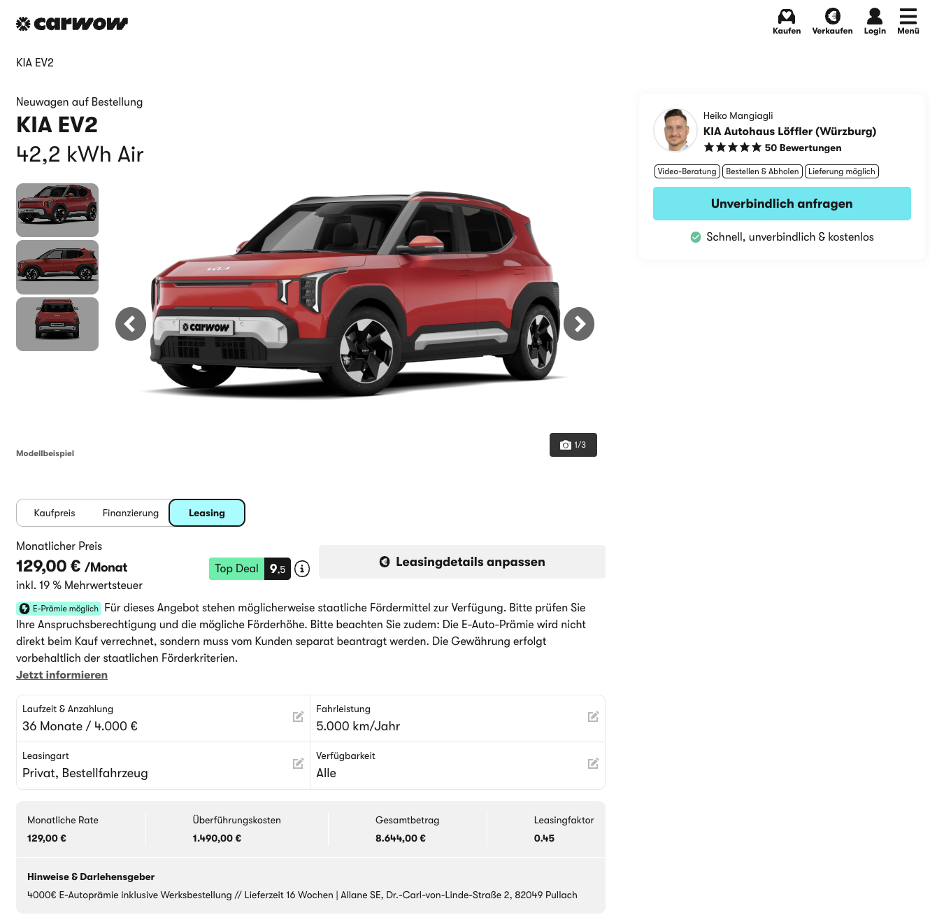Kalkuliert wurde das Angebot mit 36 Monaten Laufzeit und 5.000 Kilometern pro Jahr. Beim Platzhirsch ist der EV2 noch nicht bestallbar.