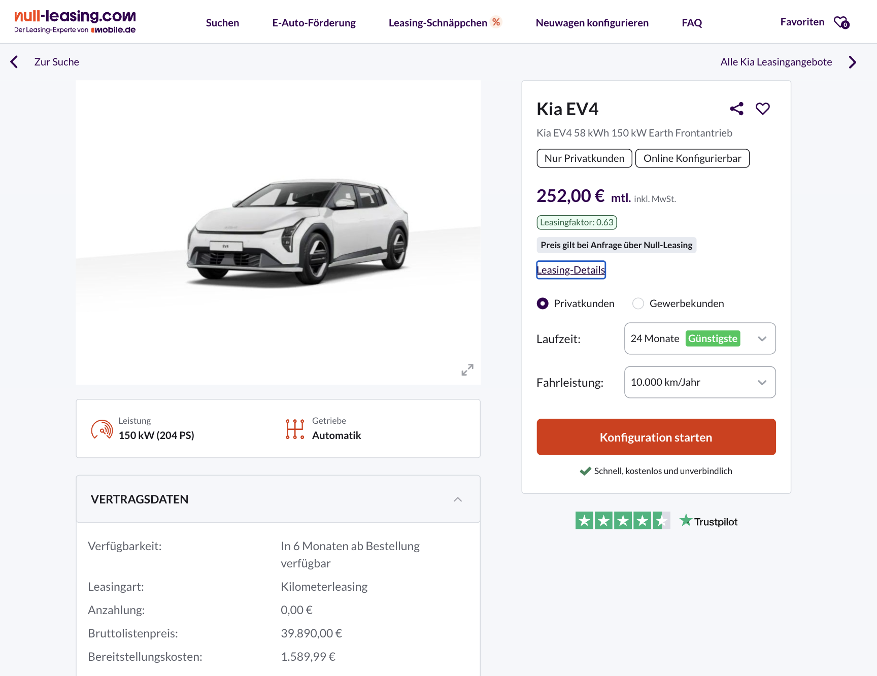 Kia EV4 im Leasing als Bestellfahrzeug für 252 Euro im Monat brutto