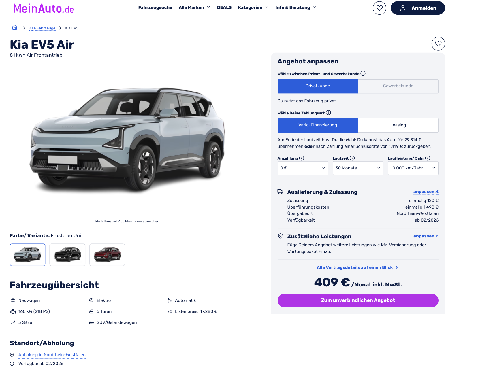 Kia EV5 im Vario-Leasing als Vorlauffahrzeug für 409 Euro im Monat brutto