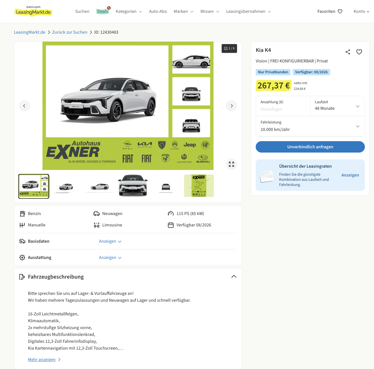 Kalkuliert ist das Angebot mit 48 Monaten Laufzeit und 10.000 Kilometern pro Jahr. Laufleistung und Laufzeit lassen sich in der Regel anpassen. Da der Kia K4 beim Marktführer aktuell nicht gelistet ist, fehlt der direkte Preisvergleich, das Angebot überzeugt hier vor allem durch die klare Ausstattung und die planbaren Kosten.