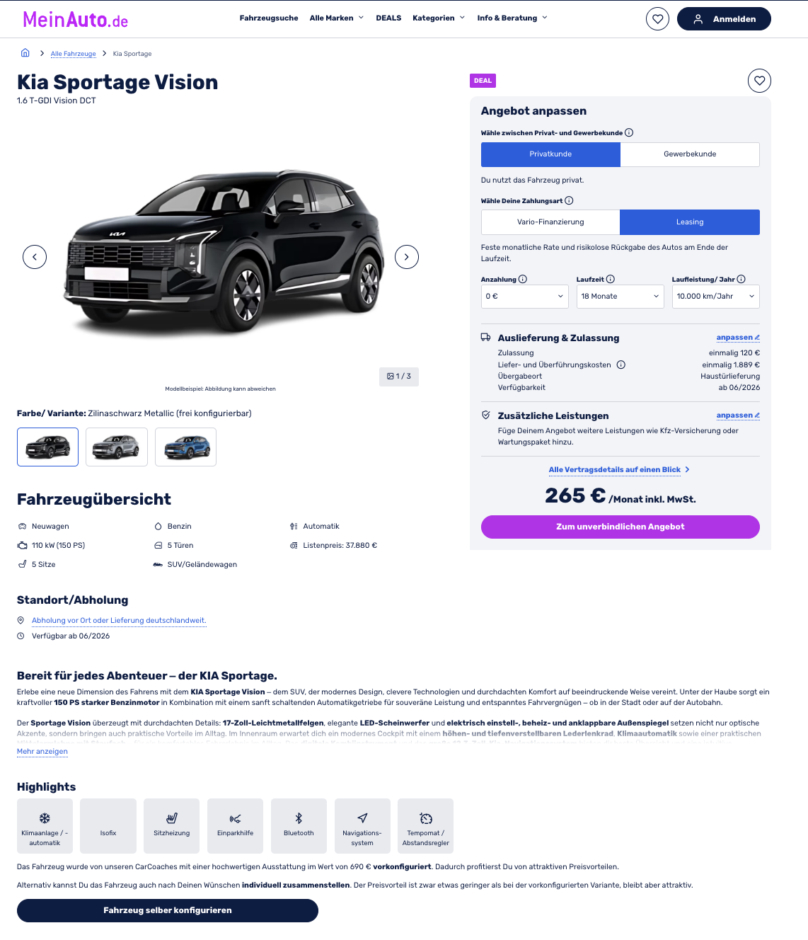 Kia Sportage Vision, solides SUV mit Automatik zum fairen Kurs. Bei MeinAuto liegt die Leasingrate für den Kia Sportage 1.6 T-GDI DCT Vision bei 265 Euro brutto pro Monat. Angeboten wird ein frei konfigurierbares Bestellfahrzeug, wodurch Farbe und Ausstattung individuell gewählt werden können. Die Auslieferung ist ab Juni 2026 vorgesehen, was eine gute Planbarkeit für den nächsten Fahrzeugwechsel ermöglicht.