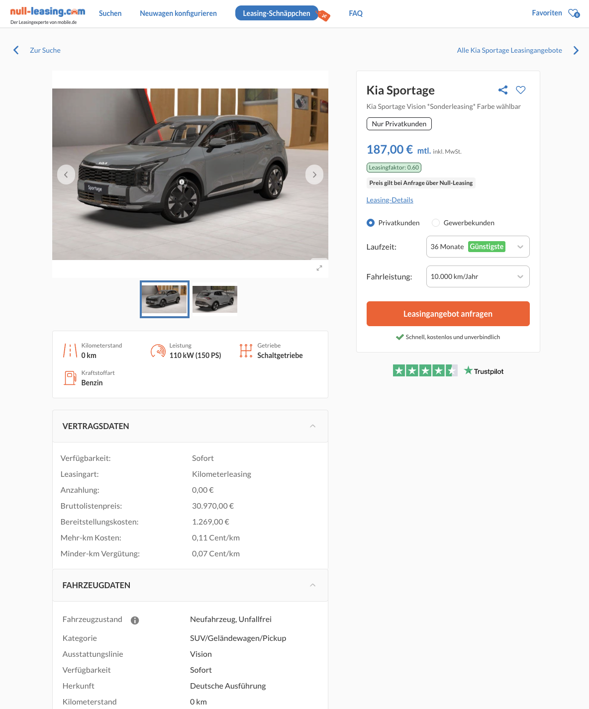 Das Leasingangebot von Null-Leasing ist auf 36 Monate und 10.000 Kilometer pro Jahr ausgelegt. Entscheidend ist der Blick auf den Markt. Vergleichbare Angebote liegen teils deutlich über 270 Euro brutto im Monat. Mit 187 Euro brutto positioniert sich dieser Sportage spürbar darunter und schafft einen echten finanziellen Abstand, ohne Abstriche bei Ausstattung oder Verfügbarkeit zu machen. Genau diese Kombination aus sofortigem Fahrzeug, fairer Rate und solider Ausstattung macht das Angebot besonders rund.