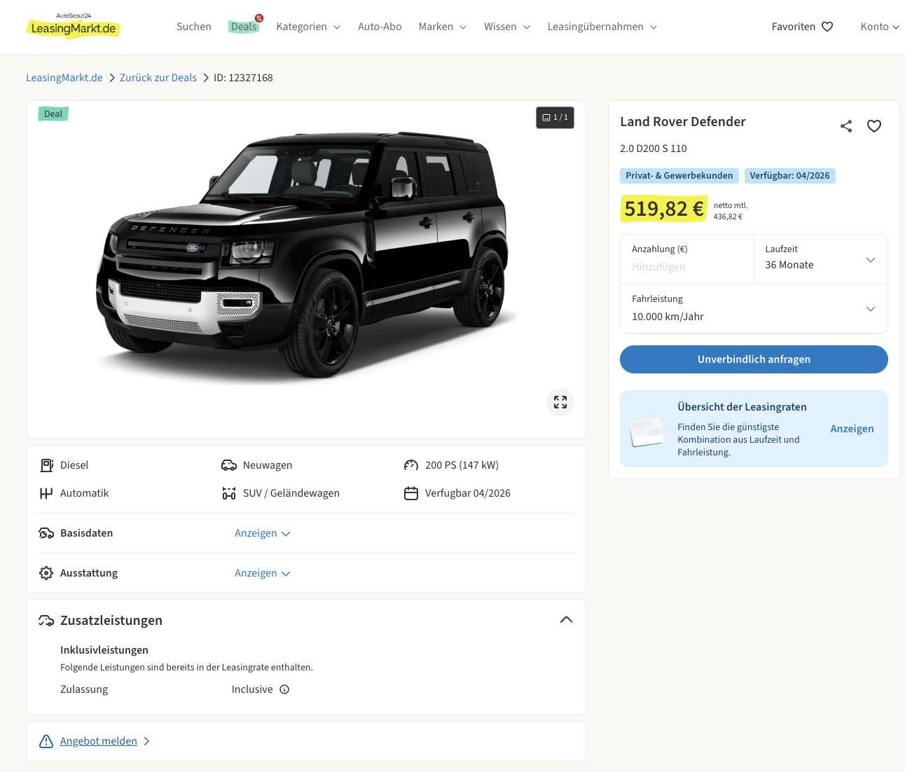 Hier kommt eine Ikone von einem Geländewagen, der Land Rover Defender D200 Allrad S 110. Bei LeasingMarkt gibt es den Defender bereits für 520 € brutto pro Monat, verfügbar ab April 2026. Wer Alltag, Abenteuer und ein klares Statement kombinieren will, findet hier die stimmige Mischung aus Substanz und Stil.