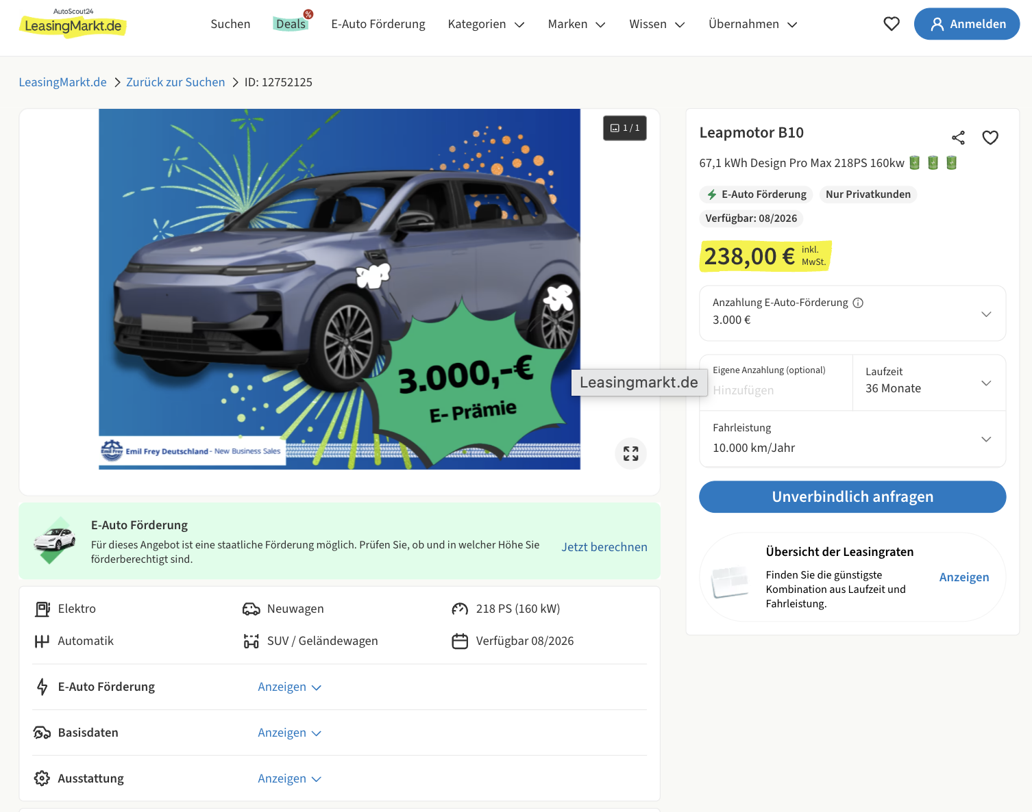 Wer beim Blick auf die aktuellen Kraftstoffpreise innerlich schon mit dem Gedanken an ein Elektroauto spielt, bekommt hier ein Angebot, das durchaus hängenbleibt. Der Leapmotor B10 67,1 kWh Design Pro Max bei LeasingMarkt für 238 Euro brutto im Monat richtet sich an alle, die ein modernes E-SUV mit ordentlicher Reichweite und umfangreicher Ausstattung suchen, ohne dafür gleich in deutlich höhere Monatsraten abdriften zu müssen. Die Berechnung erfolgt mit 3.000 Euro Sonderzahlung, angesetzt über die Umweltprämie. Wird dieser Betrag sauber auf die Laufzeit verteilt, ergibt sich eine vergleichbare, normalisierte Rate von 321,33 Euro brutto pro Monat. Genau das macht das Angebot transparenter und realistischer bewertbar. Gleichzeitig besteht eine hohe Wahrscheinlichkeit, dass die angesetzte Basisförderung vollständig erstattet wird.