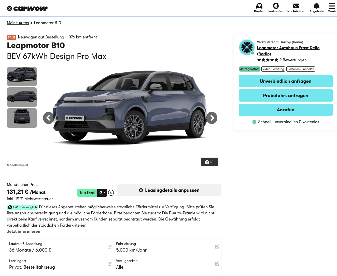 Ein neues Elektro-SUV, frei konfigurierbar, gut ausgestattet und trotzdem auf Kleinwagen-Niveau kalkuliert. Leapmotor B10 67,1 kWh Design Pro Max bei carwow für 131,21 Euro brutto im Monat ist so ein Angebot, bei dem der Preis zuerst irritiert und dann neugierig macht. Möglich wird die niedrige Monatsrate durch die maximale Umweltprämie von 6.000 Euro. Wer mit 3.000 Euro Sonderzahlung rechnet, landet bei 223,29 Euro brutto monatlich. Die Lieferzeit liegt bei rund drei Monaten.