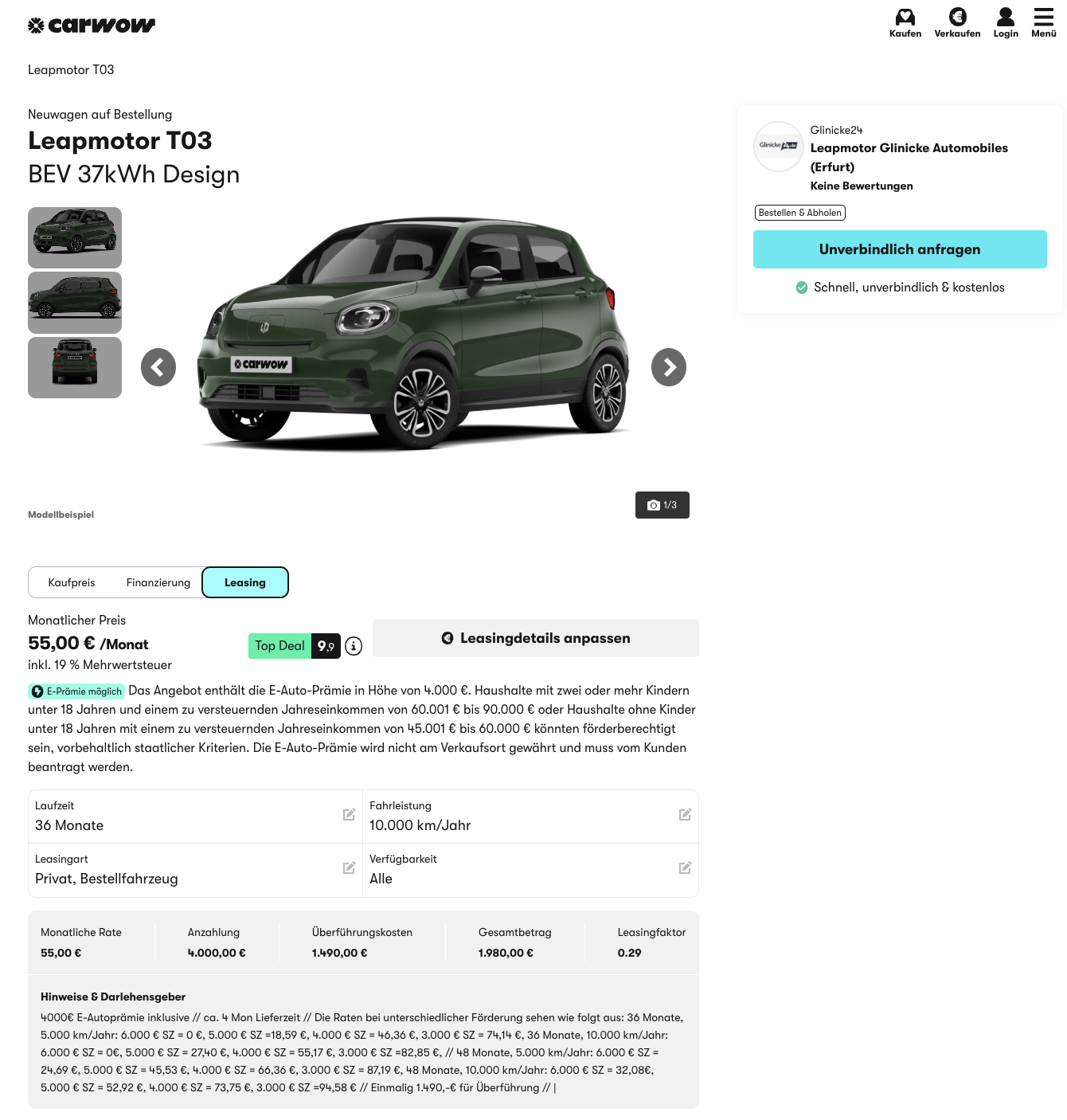 Klein, elektrisch, alltagstauglich, und vor allem erstaunlich günstig. Leapmotor T03 BEV 37,3 kWh Design bei carwow für 55 Euro brutto im Monat ist aktuell einer dieser Deals, die im Feed sofort hängen bleiben, weil die Rate so niedrig ist, dass man automatisch nach dem Haken sucht. Der Haken ist hier kein Geheimnis, sondern die Kalkulation über eine Sonderzahlung von 4.000 Euro brutto, die als Umweltprämie angesetzt wurde. Es handelt sich um ein bereits bestelltes Fahrzeug, die Lieferzeit liegt bei rund drei Monaten.