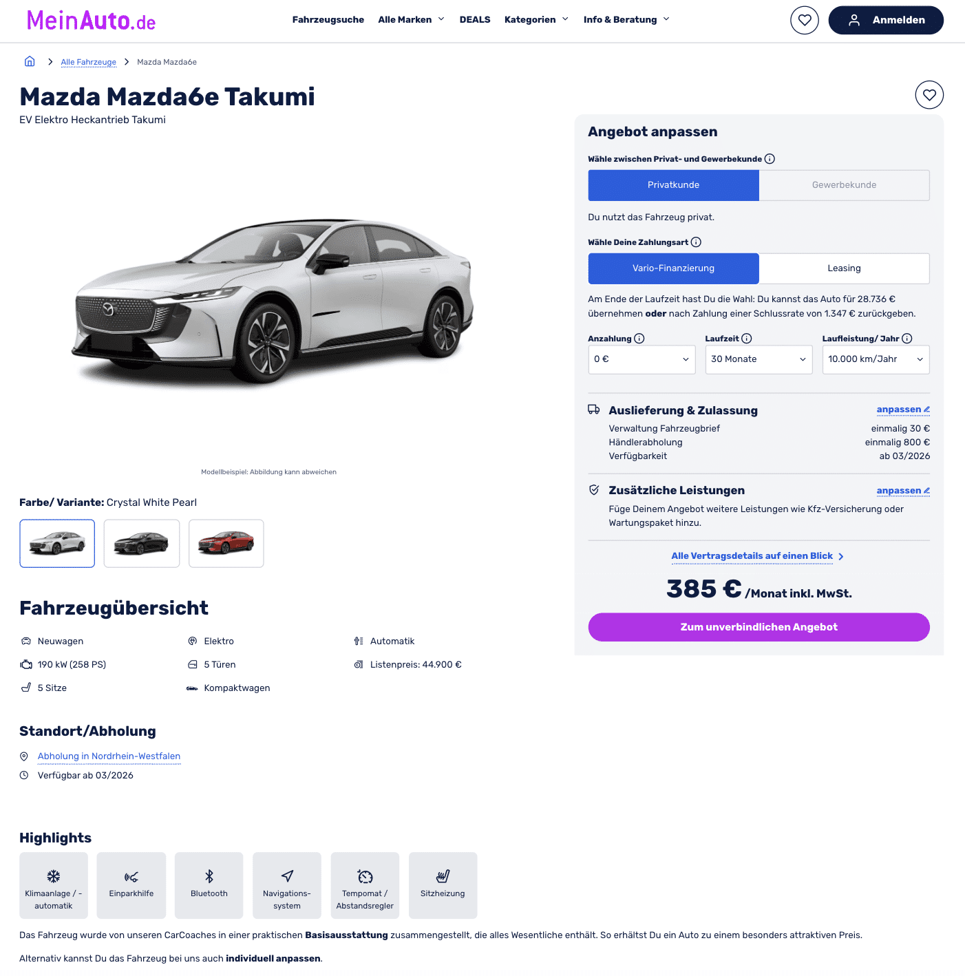 Bei MeinAuto wartet die Mazda6e Elektro Limousine Heckantrieb Takumi im Vario-Leasing für 385 Euro brutto pro Monat auf euch, individuell konfigurierbar als Bestellfahrzeug. Die Kalkulation ist klar umrissen, 30 Monate Laufzeit und 10.000 Kilometer pro Jahr bilden die Basis. Am Ende bleibt ihr flexibel, denn ihr könnt den Wagen für 28.736 Euro übernehmen oder ihn nach Zahlung einer Schlussrate von 1.347 Euro zurückgeben. Damit liegen Anbieter und Preis gleich zum Start offen auf dem Tisch, so lässt sich seriös vergleichen.