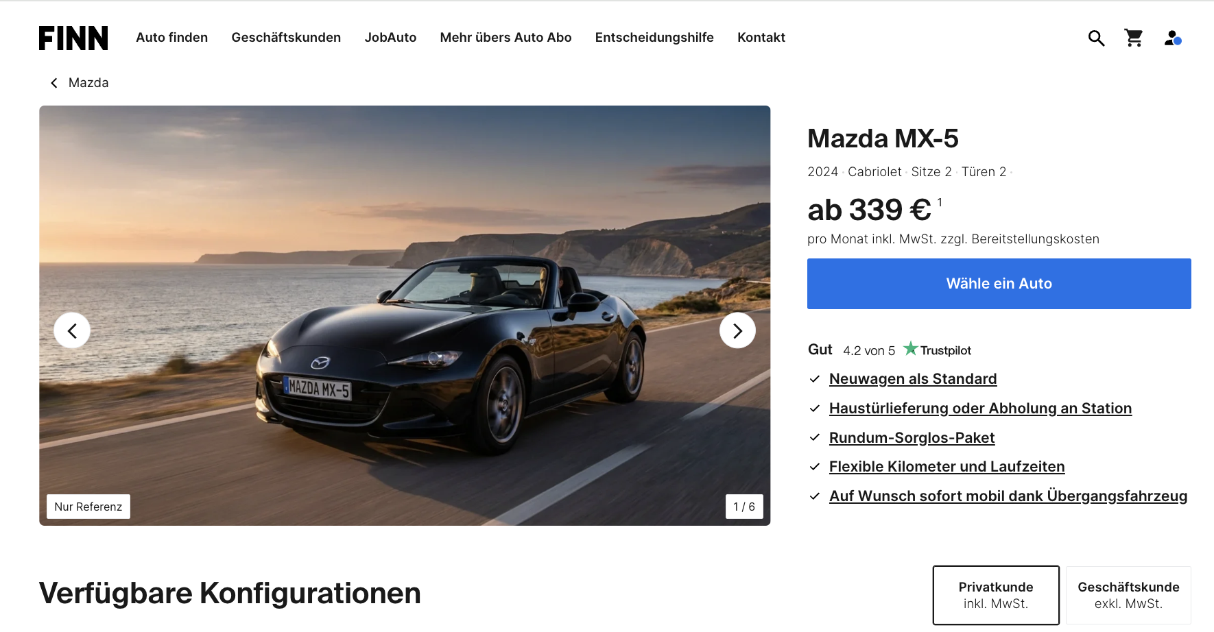Es gibt Autos, die man mit dem Kopf auswählt, und es gibt Modelle, die vor allem das Bauchgefühl ansprechen. Der Mazda MX-5 gehört ganz klar zur zweiten Kategorie. Mazda MX-5 1.5 SKYACTIV-G 132 Exclusive-Line im Auto-Abo bei FINN für 339 Euro brutto im Monat richtet sich an alle, die einen klassischen Roadster fahren möchten, ohne sich gleich langfristig festzulegen. Verfügbar ist das Fahrzeug ab dem 30.03.2026, das Cabriolet liegt bei 369 Euro brutto monatlich und bringt damit das typische Offenfahr-Gefühl in ein flexibles Abo-Modell.