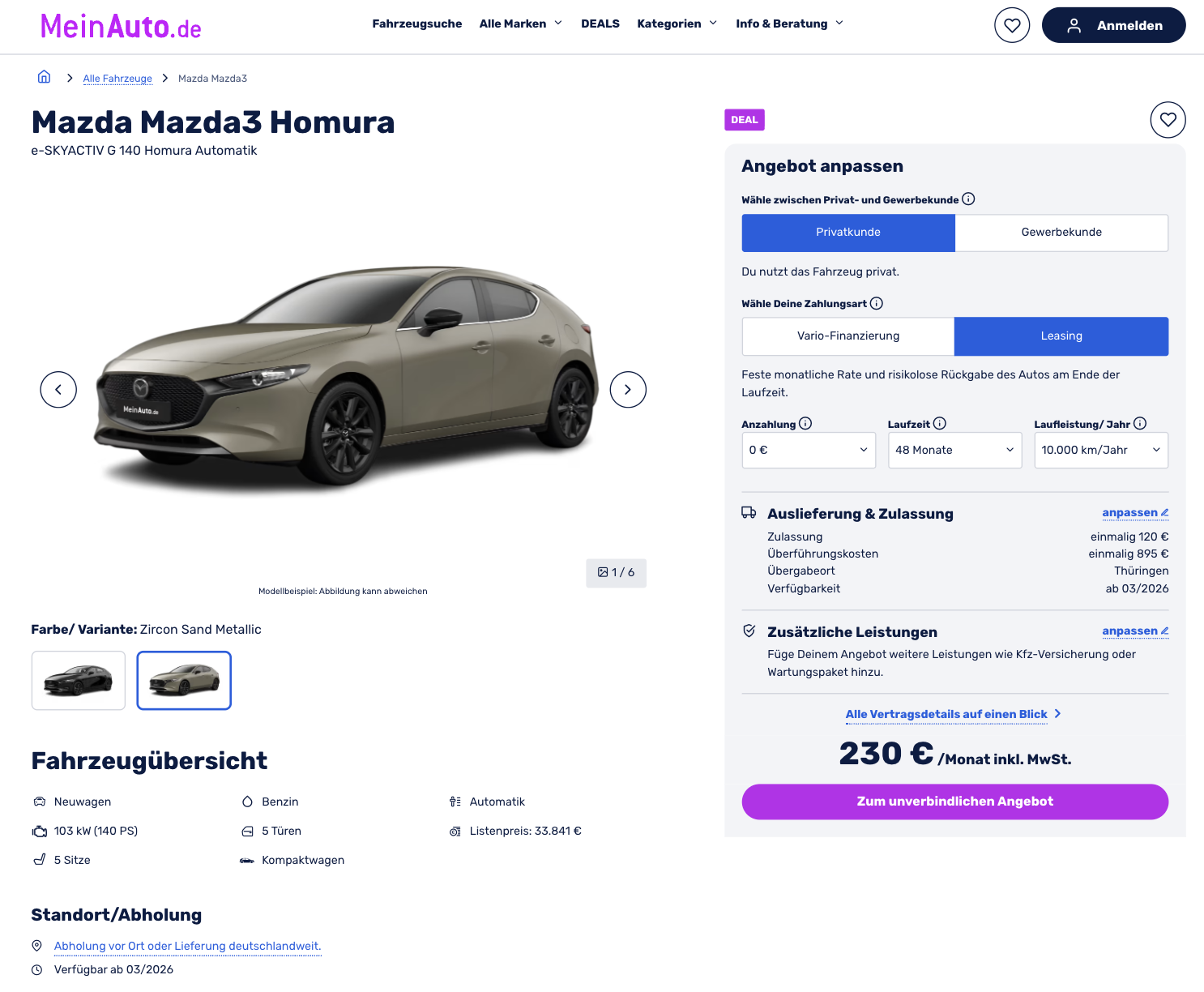 Der Mazda3 ist eine kompakte Alternative für alle, die kein Auto wollen, das laut auftritt, sondern eines, das im Alltag sauber funktioniert und hochwertig wirkt. Mazda3 e-SKYACTIV G 140 Automatik Homura bei MeinAuto für 230 Euro brutto im Monat ist aktuell ein Leasingangebot, das genau diese Idee trifft. Das Fahrzeug ist bereits bestellt und soll ab März 2026 verfügbar sein, also planbar ohne lange Ungewissheit. Farblich gibt es zwei klare Optionen, Zircon Sand Metallic für einen hellen, modernen Look oder Jet Black Metallic für den klassischen, zurückhaltenden Auftritt.