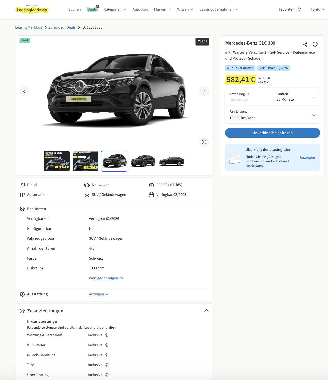Souveräner Diesel, sportliche Linie und viele Extraleistungen. Bei LeasingMarkt gibt es aktuell den Mercedes-Benz GLC 300 d 4MATIC Coupé AMG Line Advanced für 582,41 Euro brutto pro Monat im Full-Service-Leasing. Das Angebot richtet sich an Privatkunden und deckt bereits Wartung, Verschleiß, 8-fach-Bereifung, Kfz-Steuer, TÜV, Überführung und Zulassung ab, die Lieferzeit liegt bei etwa 18 bis 20 Wochen, konfiguriert wird klassisch über den Händler.