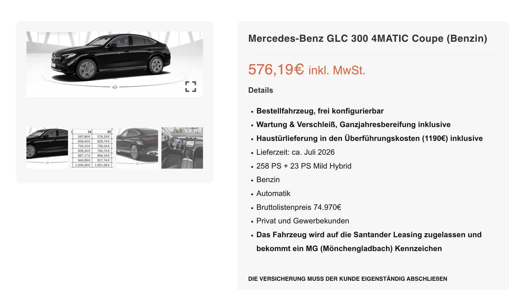 Ein Coupé-SUV, das auf langen Strecken seine Stärken ausspielt und dabei angenehm unaufgeregt bleibt. Mercedes-Benz GLC 300 d 4MATIC Coupé bei Leasing-Fux für 576,19 Euro brutto pro Monat ist als. Wartung & Verschleiß sowie Ganzjahresbereifung sind im Preis enthalten, was die laufenden Kosten gut planbar macht. Angeboten wird das Fahrzeug als frei konfigurierbares Bestellfahrzeug, die Ausstattung lässt sich also an eure Anforderungen anpassen. Die Lieferzeit liegt bei etwa Juli 2026. Die Haustürlieferung ist bereits in den Überführungskosten von 1.190 Euro enthalten.