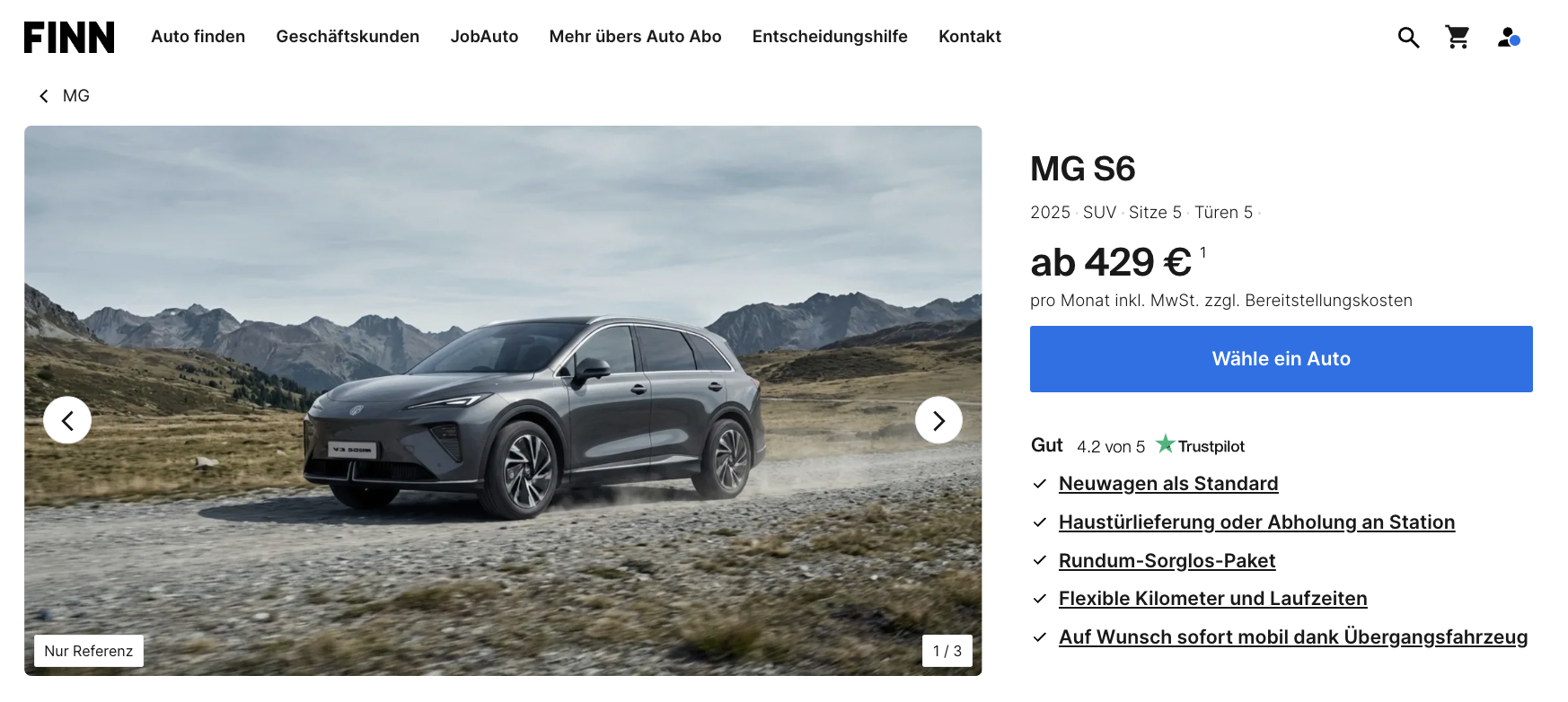 Der MG S6 77 kWh Long Range Luxury bei FINN für 429 Euro brutto im Monat ist ein Angebot für alle, die ein großes Elektro-SUV fahren möchten, ohne sich direkt auf Kauf oder klassisches Leasing festzulegen. Genau darin liegt der Reiz dieses Modells. Statt sich um mehrere Verträge und laufende Nebenkosten zu kümmern, läuft hier fast alles über eine feste Monatsrate. Verfügbar ist der MG ab dem 22.04.2026, kalkuliert wurde das Abo mit 18 Monaten Laufzeit und 500 Kilometern pro Monat. Beides lässt sich bei Bedarf anpassen, wenn ein anderes Fahrprofil besser passt.