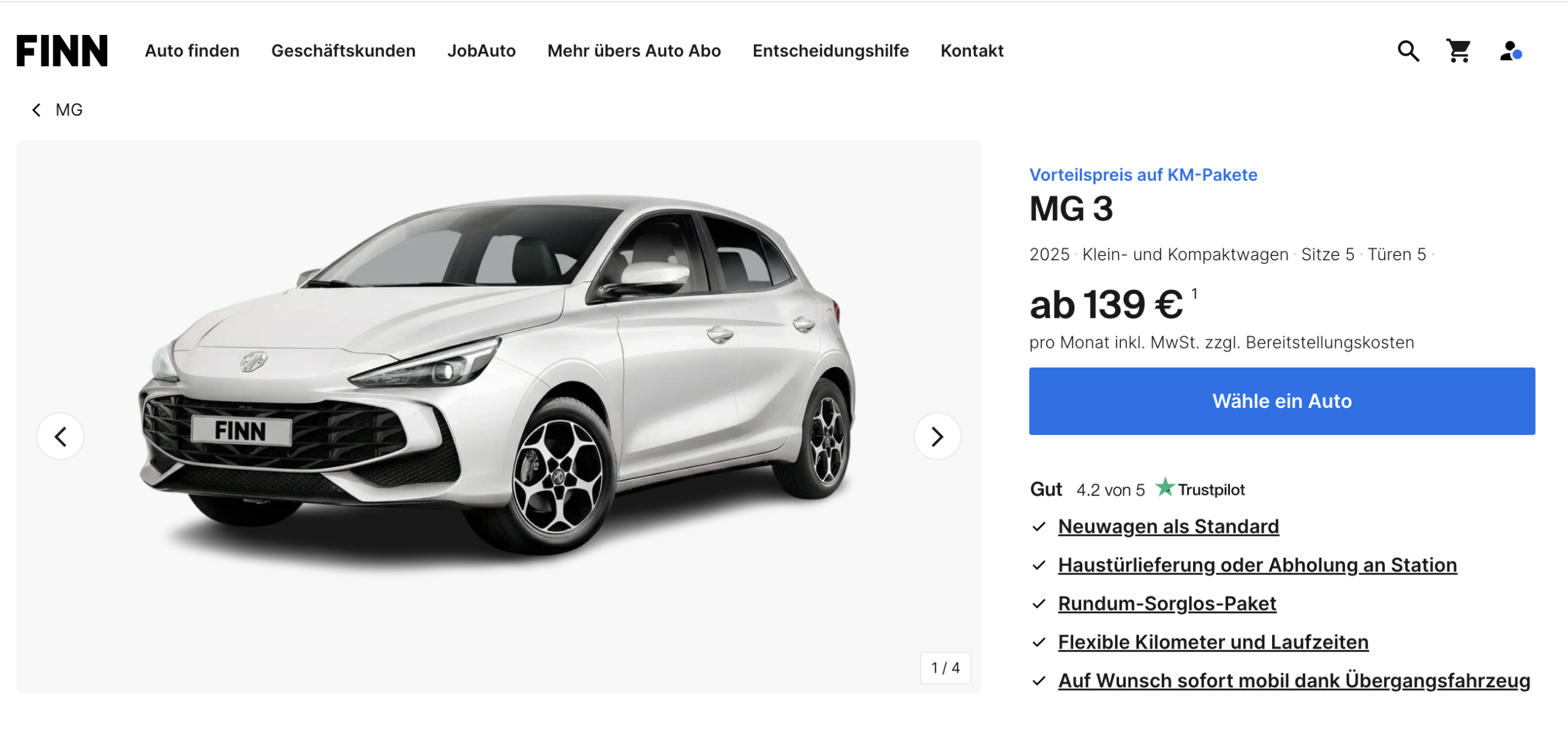 Wer einfach mobil sein will, ohne sich gleich auf klassische Leasingmodelle oder eine Finanzierung festzulegen, landet schnell beim Auto-Abo. Genau dort wird der MG MG3 interessant. MG MG3 1.5l 85 kW bei FINN für 139 Euro brutto im Monat richtet sich an alle, die ein kompaktes Auto mit überschaubaren Kosten suchen und dabei möglichst wenig organisatorischen Aufwand haben möchten. Der große Unterschied zum klassischen Fahrzeugmodell liegt im Gesamtpaket, denn hier sind viele Posten schon enthalten, die sonst zusätzlich Zeit, Geld und Nerven kosten würden. Zulassung, TÜV, Inspektionen, Verschleiß und Reifenwechsel laufen bereits über die monatliche Rate. Geliefert wird auf Wunsch bis vor die Haustür oder alternativ an eine Abholstation.