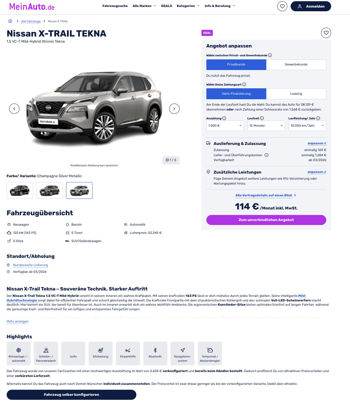 Ein großes SUV für Alltag, Familie und viel Gepäck, aber mit einer Rate, die eher nach Kleinwagen klingt. Nissan X TRAIL 1.5 VC T Mild Hybrid Xtronic Tekna bei MeinAuto für 114 Euro brutto im Monat, im Vario Leasing mit 1.000 Euro Anzahlung. Kalkuliert ist das Angebot mit 12 Monaten und 10.000 Freikilometern. Nach Ablauf der Laufzeit gibt es zwei Wege, Übernahme für 38.139 Euro oder Rückgabe gegen 1.568 Euro Schlussrate. Das Fahrzeug ist vorkonfiguriert und ab März in Champagne Silver Metallic, Dark Grey Metallic oder Diamant Black Metallic vorgesehen.