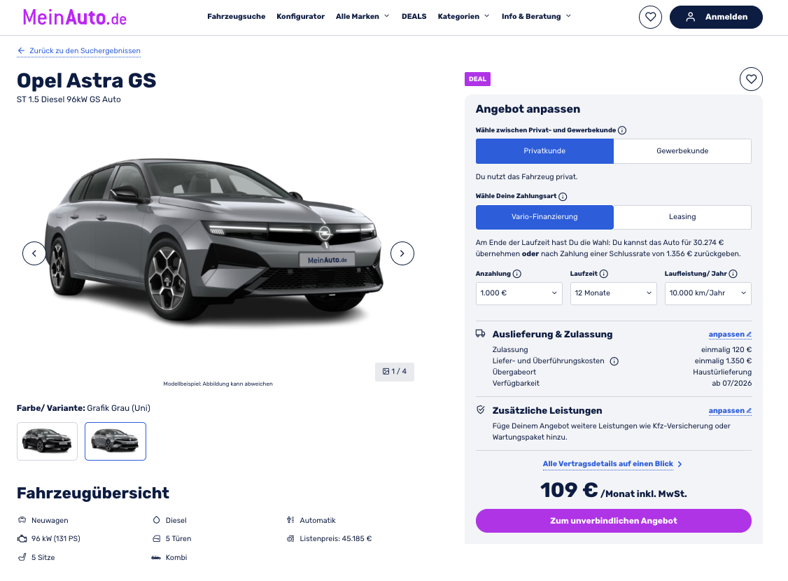 Ein Kombi, der viel Platz bietet, sparsam unterwegs ist und gleichzeitig modern aussieht, genau hier setzt der Opel Astra ST an. MeinAuto bietet den Opel Astra Sports Tourer Diesel GS aktuell für 109 Euro brutto pro Monat im Vario-Leasing an. Die Kalkulation basiert auf 1.000 Euro Anzahlung und 12 Monaten Laufzeit. Das Fahrzeug ist bereits bestellt und ab Juli 2026 verfügbar, wodurch sich eine überschaubare Wartezeit ergibt.