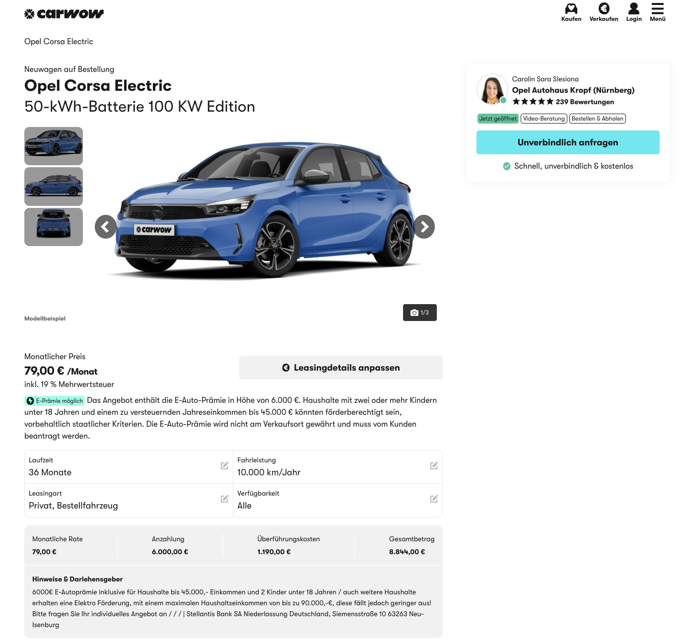 Der Opel Corsa-e ist ein Elektro-Kleinwagen, der den Einstieg in die E-Mobilität preislich sehr niedrig ansetzt und dabei alltagstauglich bleibt. Opel Corsa-e bei carwow für 79 Euro brutto pro Monat im Privatleasing, angeboten als frei konfigurierbares Bestellfahrzeug. Kalkuliert wurde die Rate mit 6.000 Euro Sonderzahlung über die angesetzte Umweltprämie. Die Lieferzeit liegt bei rund drei Monaten, damit ist das Angebot nicht nur günstig, sondern auch relativ schnell verfügbar.