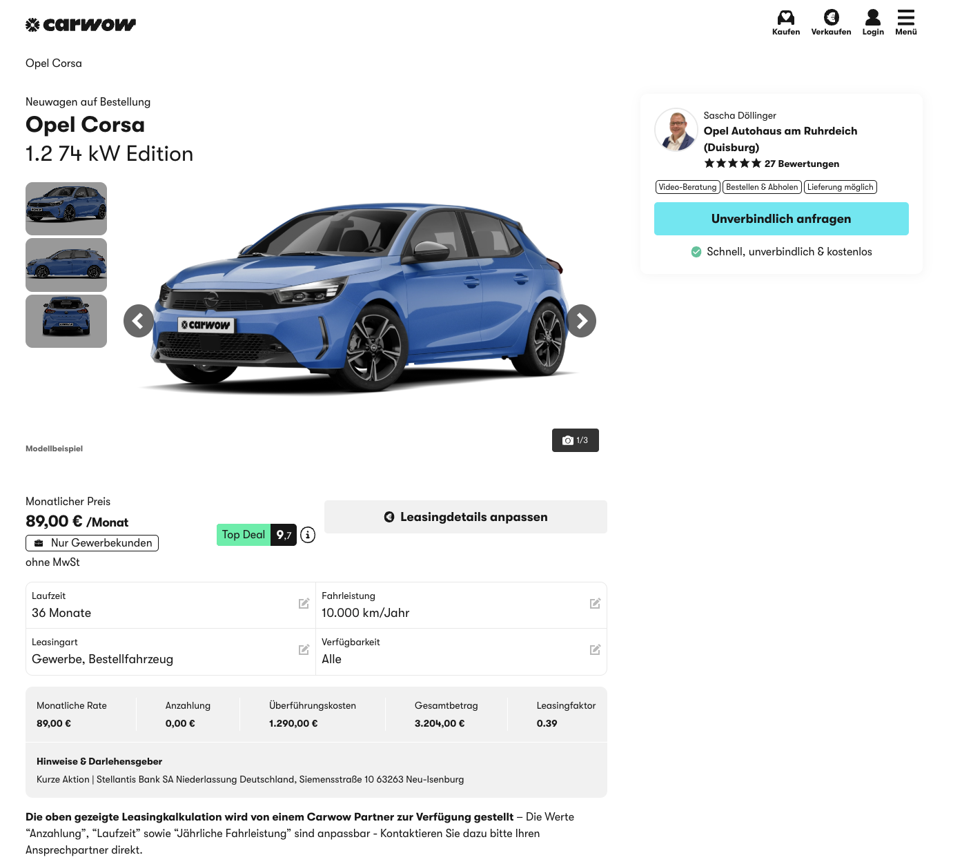 Der Opel Corsa ist ein Kleinwagen, der sich im Alltag leicht fährt, wenig Platz braucht und trotzdem erwachsen wirkt. Opel Corsa 1.2 Turbo Edition bei carwow für 89 Euro netto pro Monat ist das aktuelle Angebot für Geschäftskunden. Es handelt sich um ein frei konfigurierbares Bestellfahrzeug, wodurch sich Motorisierung, Farbe, Felgen und Ausstattungspakete passend zum Einsatz zusammenstellen lassen.