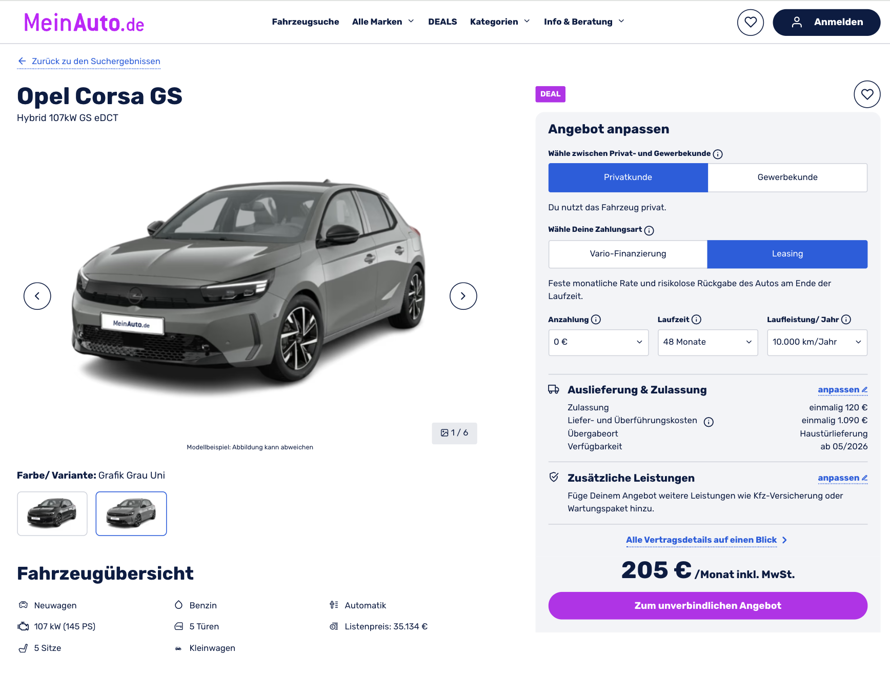 Ein effizienter Kleinwagen muss heute mehr können als nur günstig fahren. Der Opel Corsa Hybrid 107 kW eDCT GS bei MeinAuto für 205 Euro im Monat zeigt, wie attraktiv ein modernes Leasingangebot im Alltag sein kann. Das Fahrzeug ist bereits bestellt und soll ab Mai verfügbar sein. Zur Wahl stehen Grafik Grau Uni und Karbon Schwarz Metallic. Gerade für alle, die angesichts steigender Kraftstoffpreise bewusst rechnen, wirkt dieses Angebot besonders interessant.