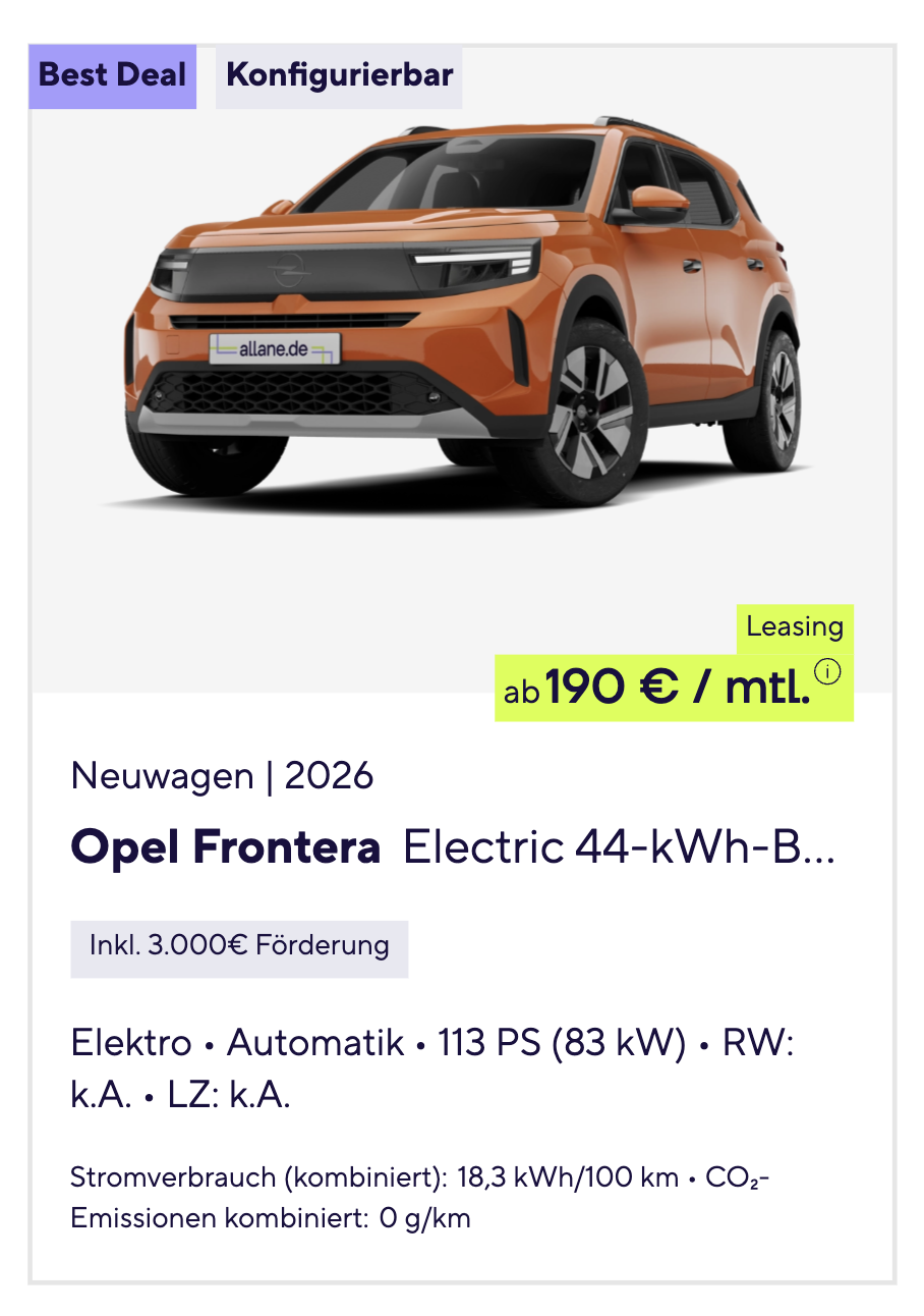 Der Opel Frontera Electric ist kein E-Auto für Effekthascherei, sondern ein sauber kalkulierter Alltagsbegleiter mit viel Nutzwert. Opel Frontera Electric 44 kWh Edition bei Allane für 190 Euro brutto im Monat bringt genau dieses Konzept in ein Vario-Leasing, das besonders durch seine Flexibilität interessant wird. Gerechnet wurde das Angebot mit der Basis-Umweltprämie von 3.000 Euro, einer Laufzeit von 48 Monaten und 10.000 Kilometern pro Jahr. Gleichzeitig bleibt der Frontera als frei konfigurierbares Bestellfahrzeug offen für individuelle Wünsche. Wer das Modell am Ende behalten möchte, kann es für 12.030,85 Euro übernehmen. Alternativ ist auch die Rückgabe möglich, dann fällt eine Schlussrate von 869,70 Euro an. Hinzu kommen 951,30 Euro Überführungskosten.