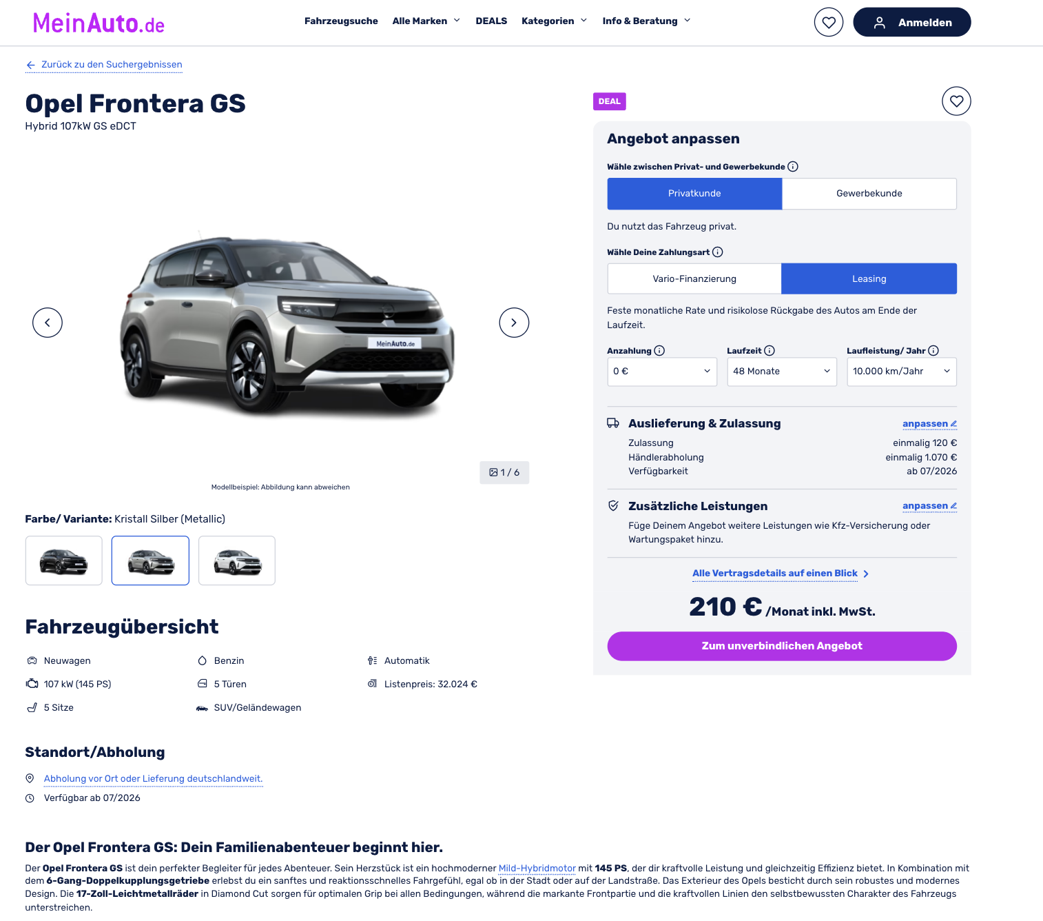 Der Opel Frontera Hybrid in der GS Ausführung ist ein kompaktes SUV, das moderne Technik und praktischen Nutzwert zusammenbringt. Opel Frontera Hybrid 107 kW eDCT GS bei MeinAuto für 210 Euro brutto pro Monat ist als Privatleasing kalkuliert. Das Fahrzeug ist bereits bestellt, die Auslieferung ist für Juli vorgesehen. Verfügbar ist der Frontera in Kristall Silber, Karbon Schwarz oder Arktis Weiß, wodurch die Auswahl alltagstauglich bleibt und nicht an Einzelfarben hängt.