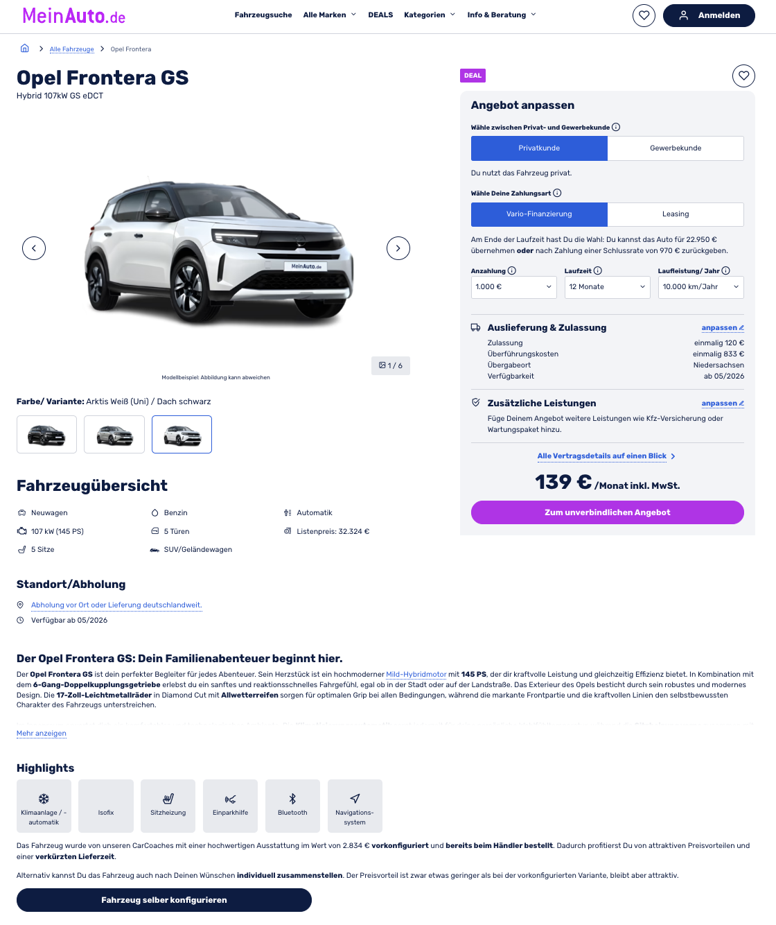 Kompakt, flexibel und genau auf Alltag getrimmt. Opel Frontera Hybrid 107 kW eDCT GS bei MeinAuto für 139 Euro brutto im Monat, mit 1.000 Euro Anzahlung, als bereits bestelltes und üppig vorkonfiguriertes Fahrzeug. Die Auslieferung ist für Mai 2026 geplant, bei der Farbe stehen Karbon Schwarz Metallic, Kristall Silber Metallic oder Arktis Weiß Uni zur Wahl. Nach den 12 Monaten bleibt die Entscheidung offen, entweder Übernahme für 22.950 Euro oder Rückgabe nach Zahlung einer Schlussrate von 970 Euro. Wer auch die Anzahlung verzichtet, zahlt 223 Euro im Monat brutto.