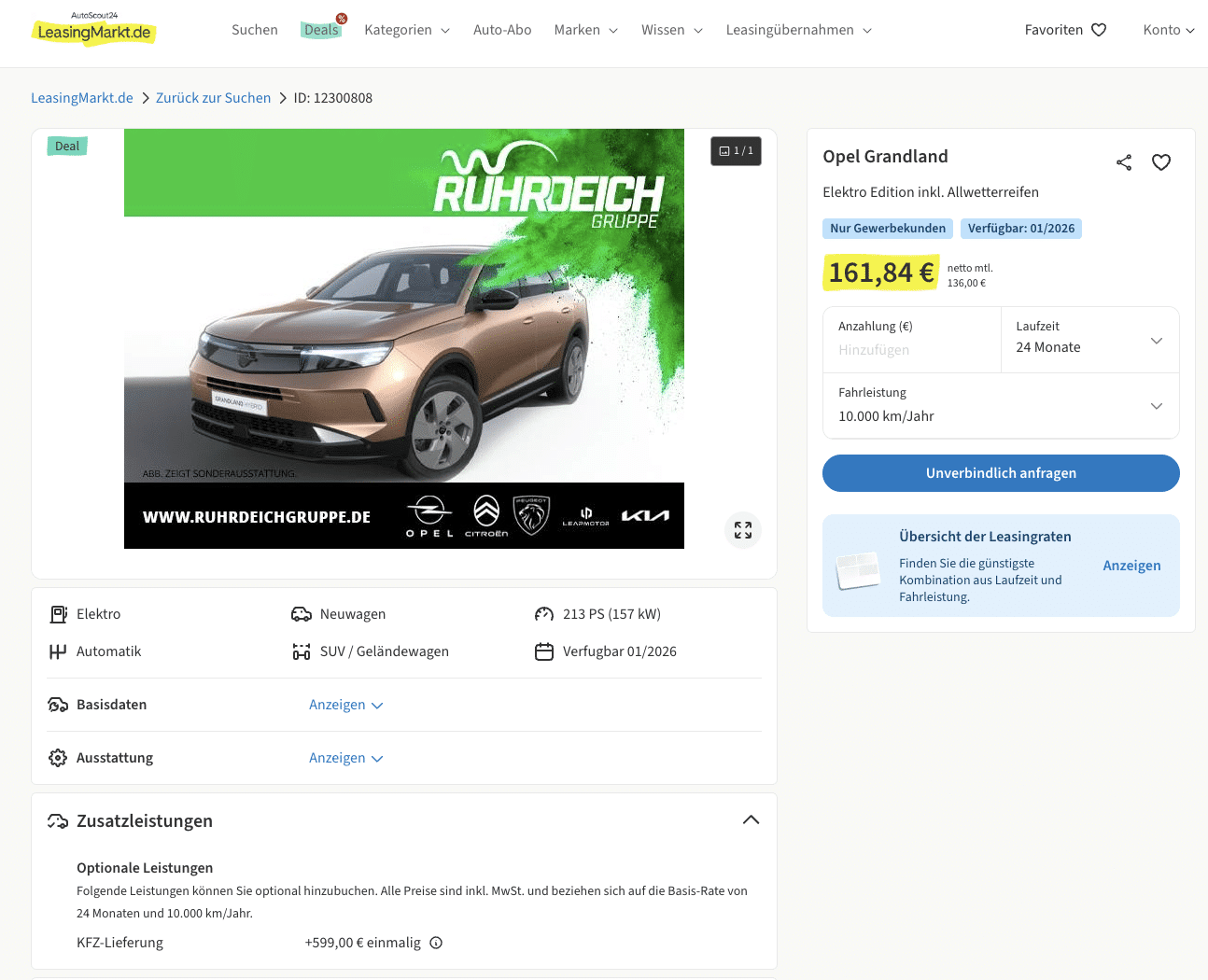 Er ist elegant, leise und selbstbewusst, der neue Opel Grandland Electric bringt frischen Wind in die Klasse der E-SUVs. Bei LeasingMarkt wartet das Modell in der Edition-Ausstattung euch für 136 Euro netto im Monat. Und das Beste: Das Auto ist bereits bestellt, in der Farbe Impakt Kupfer Metallic, und ab Januar 2026 bereit, die Straßen zu elektrisieren.