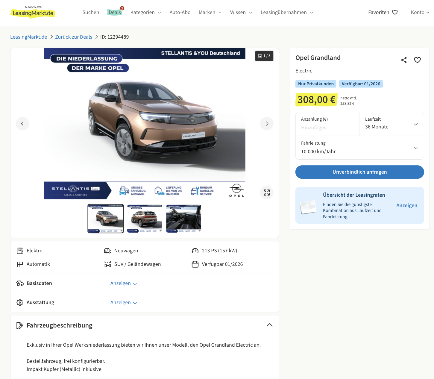 Hier kommt ein E-SUV mit viel Raum, wenig Geräusch und klarer Kalkulation! Bei LeasingMarkt steigt ihr in den Opel Grandland Electric 73 kWh 157 kW Edition für 308 Euro brutto pro Monat ein, Privatleasing, als frei konfigurierbares Bestellfahrzeug. Impakt Kupfer Metallic ist bereits inklusive, wer Karbon Schwarz, Spektrum Blau oder Kristall Silber Metallic bevorzugt, ergänzt nur 6 Euro pro Monat, ihr haltet also den Preisrahmen und gebt dem Auftritt eure Handschrift.